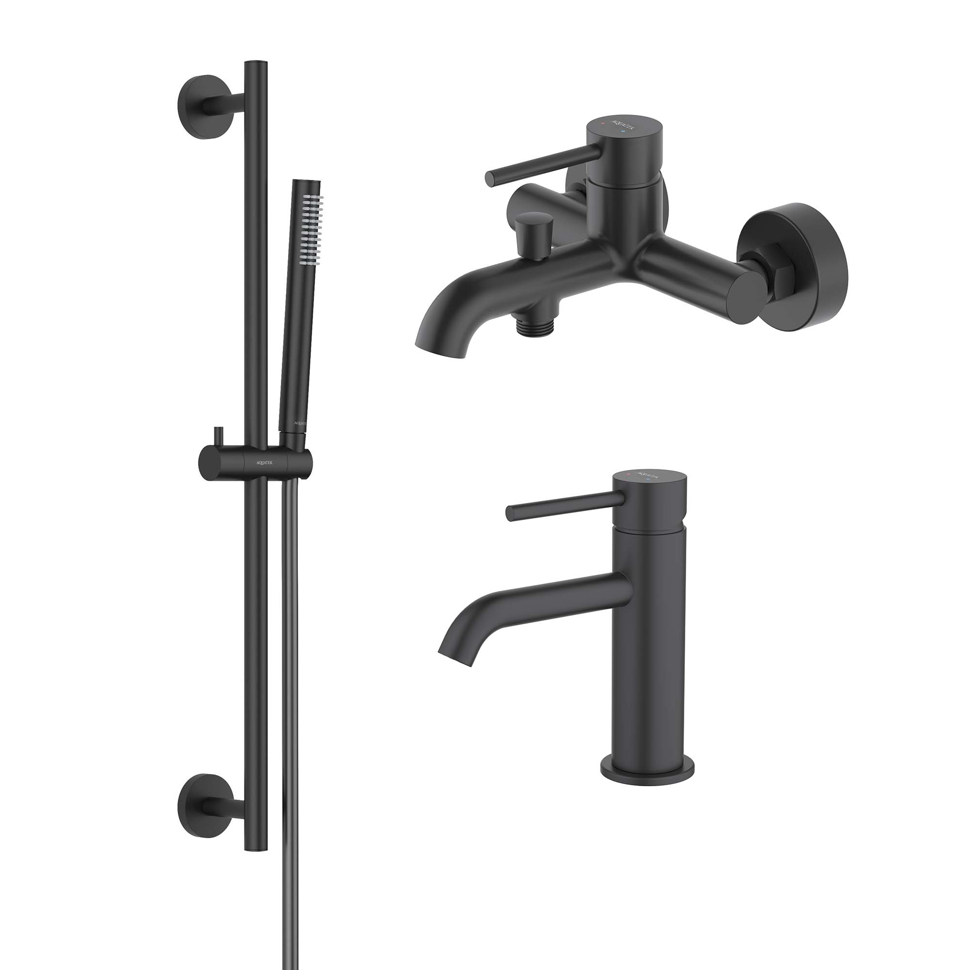 Набор смесителей 3 в 1 для ванны с коротким изливом Aquatek Европа AQ1330MB: смеситель для раковины + смеситель для ванны + душевой гарнитур, материал латунь, цвет чёрный матовый.