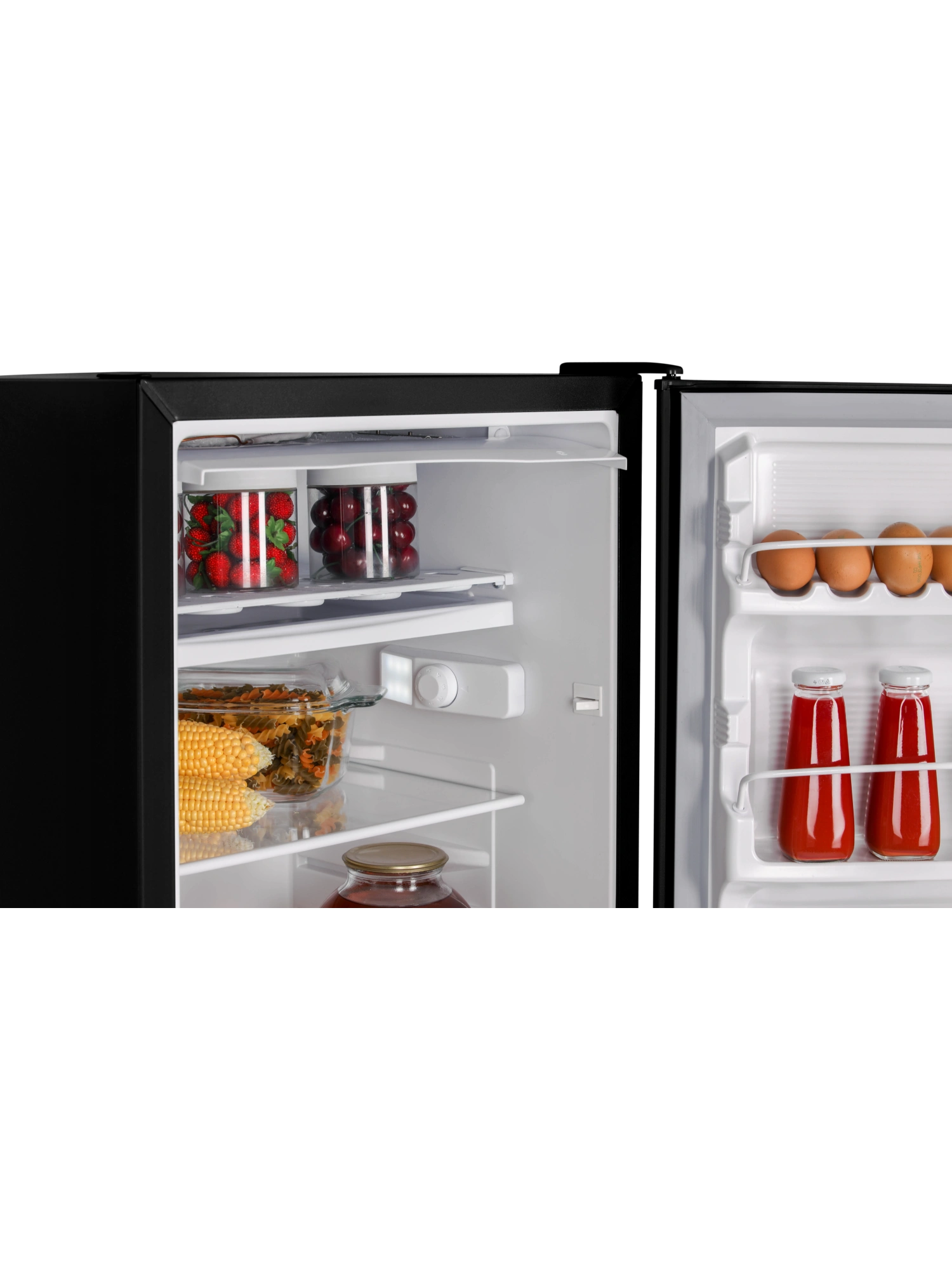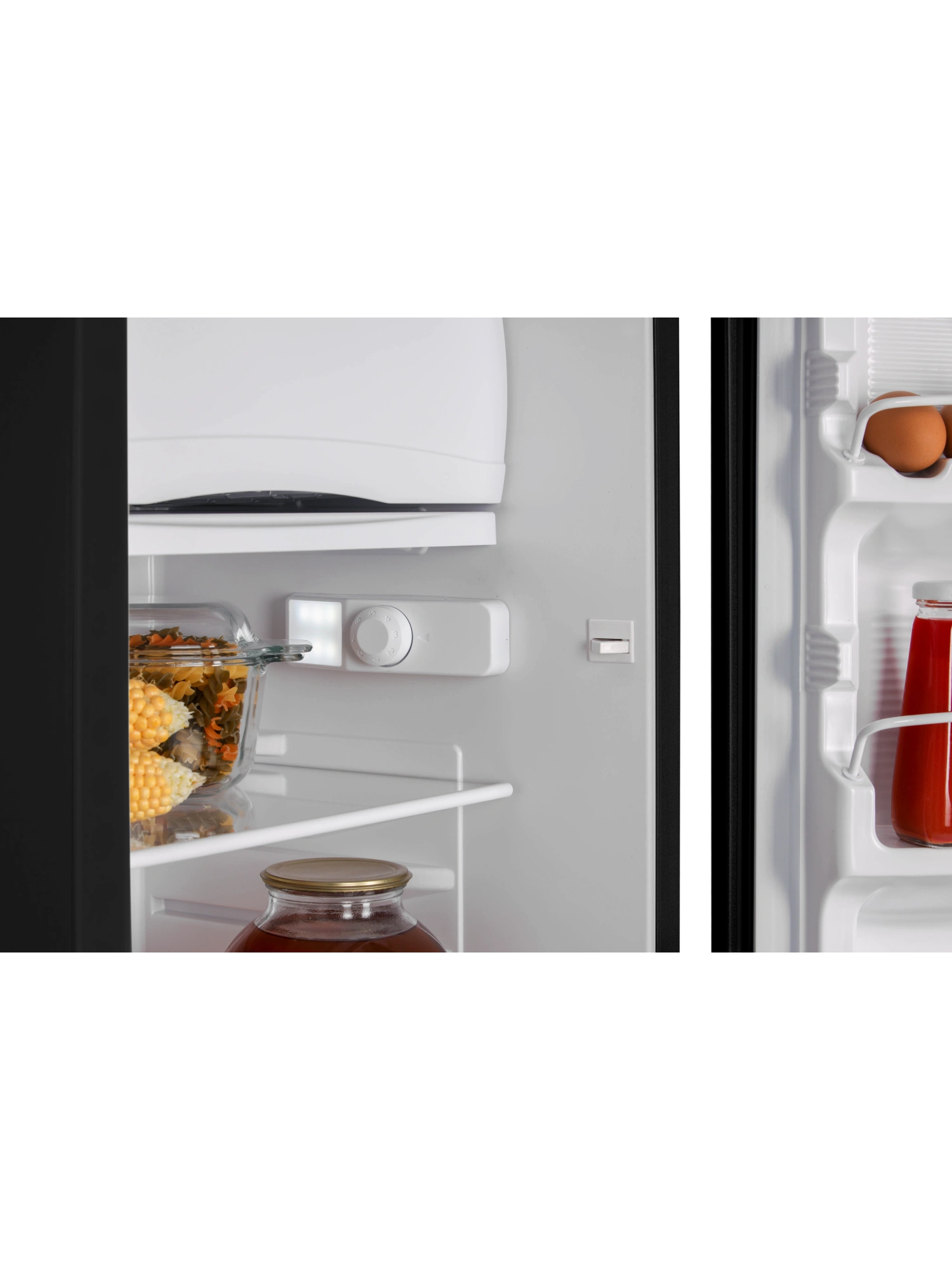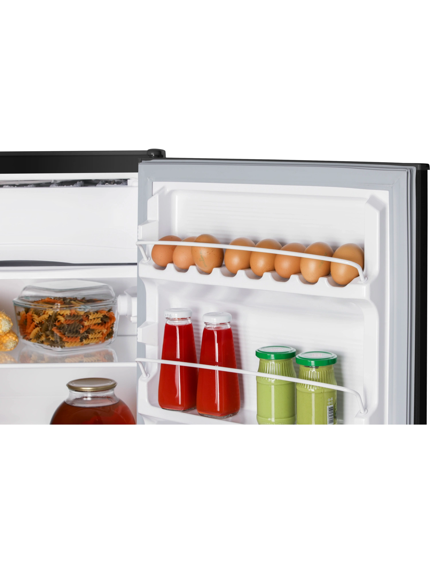 - Две полки в холодильном отделении выполнены из закаленного стекла. Небольшие полки на дверце холодильника предусмотрены для бутылок, соусов, яиц и герметичных упаковок с сырами, йогуртами.