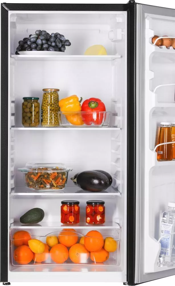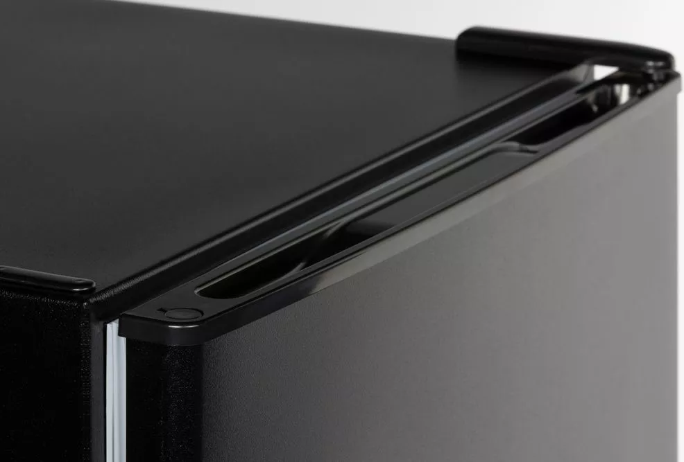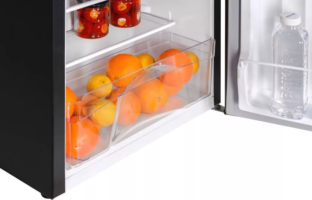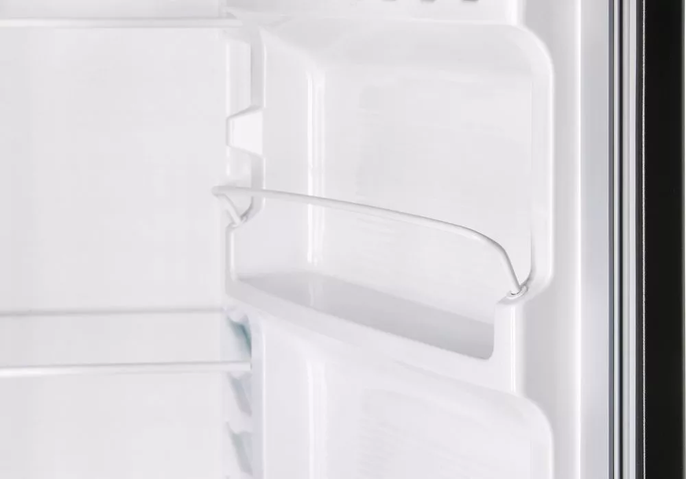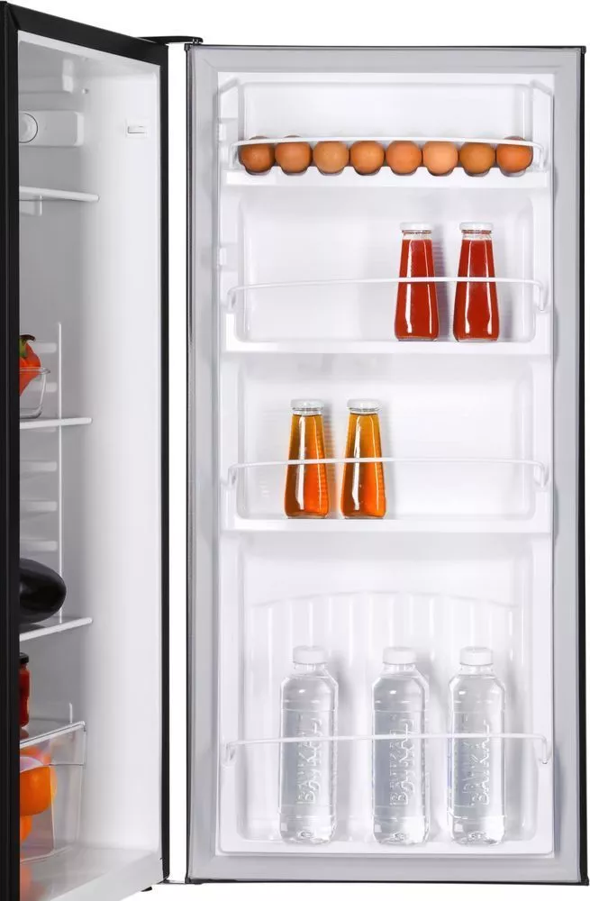 - Дверь с интегрированной горизонтальной ручкой имеет возможность перенавешивания на другую сторону для комфортного открывания и установки модели в удобном месте. Корпус холодильника выполнен в черном цвете.