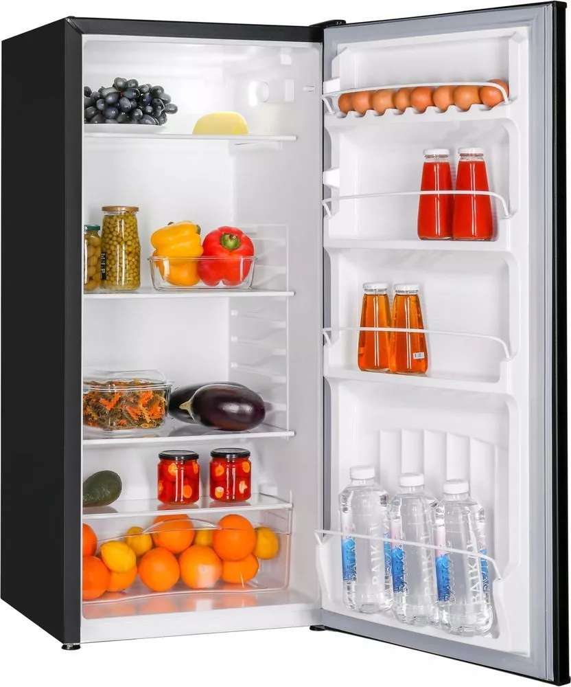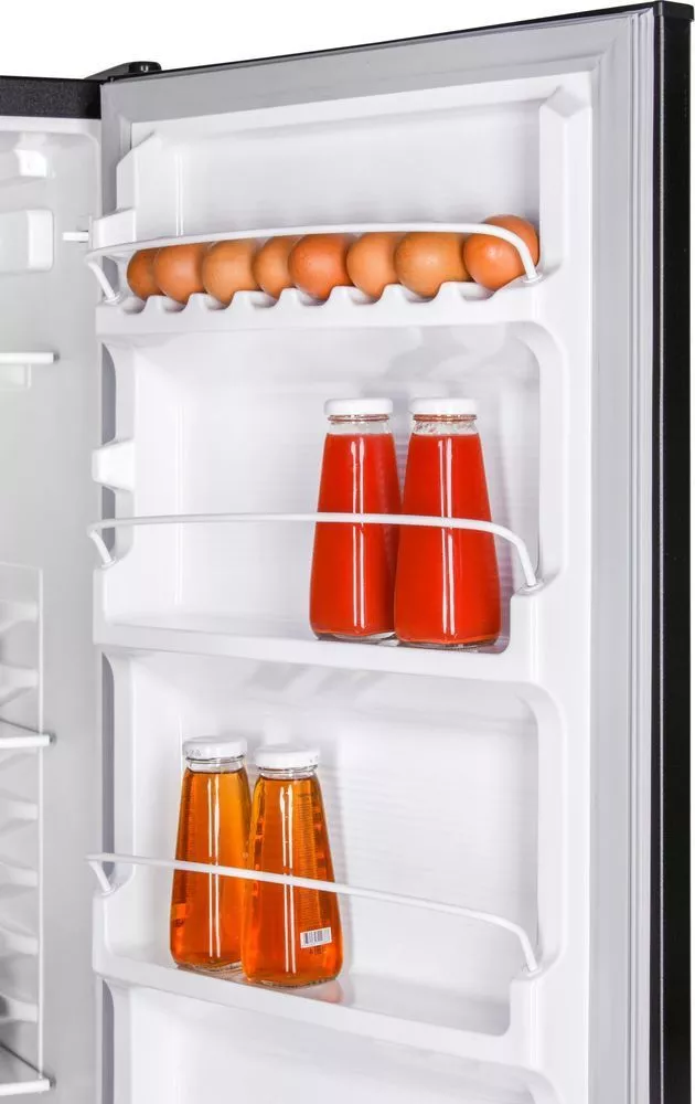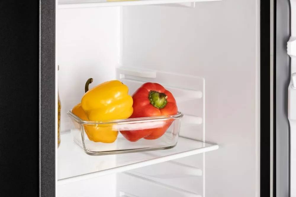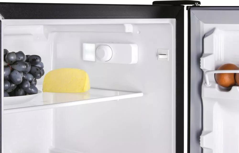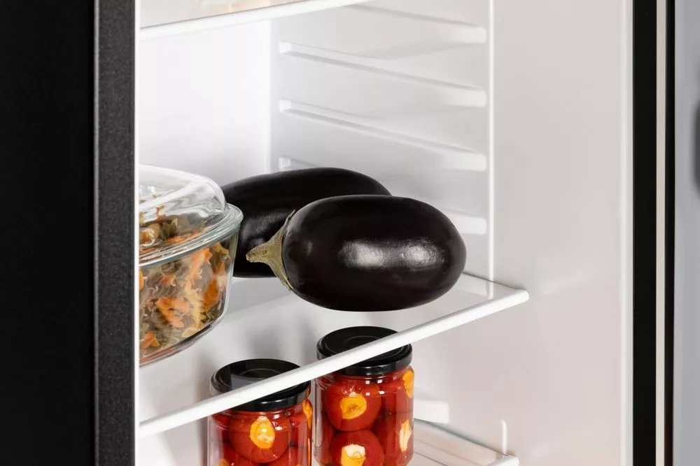 - Дверь с интегрированной горизонтальной ручкой имеет возможность перенавешивания на другую сторону для комфортного открывания и установки модели в удобном месте. Корпус холодильника выполнен в черном цвете.