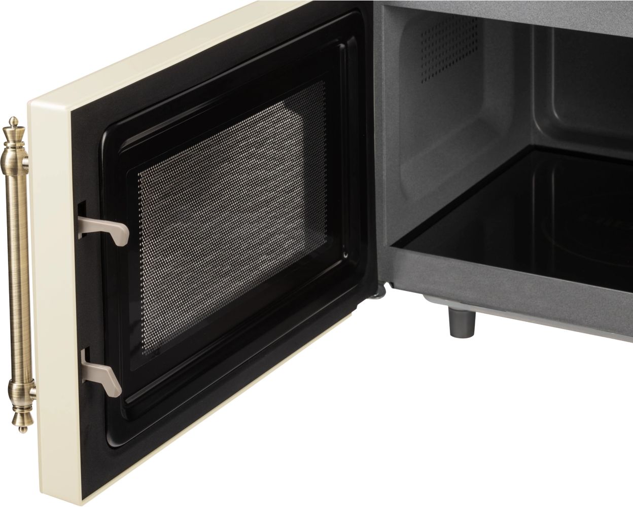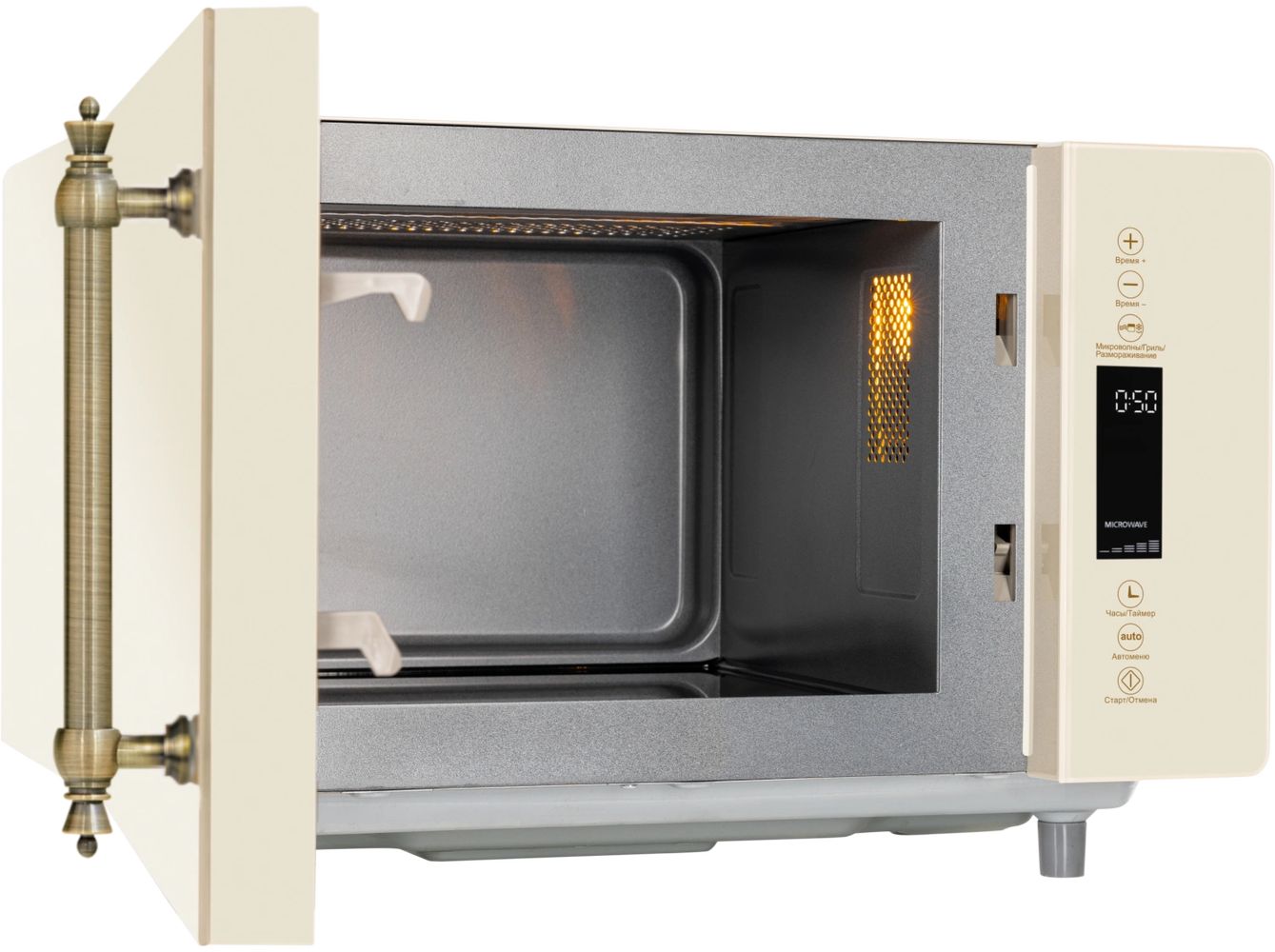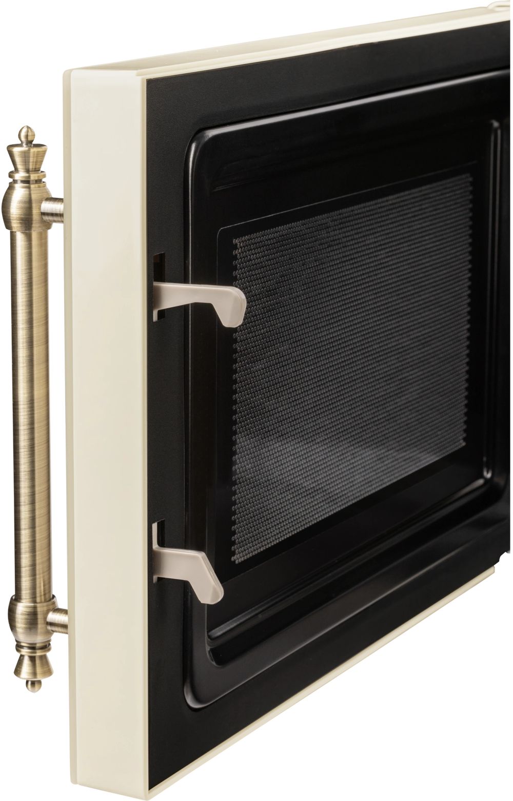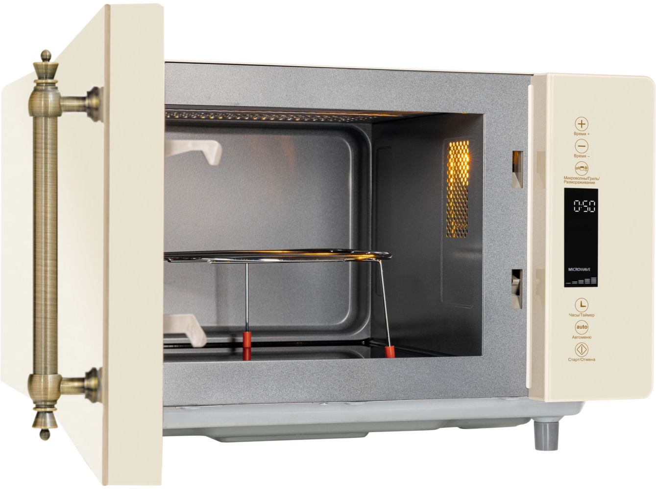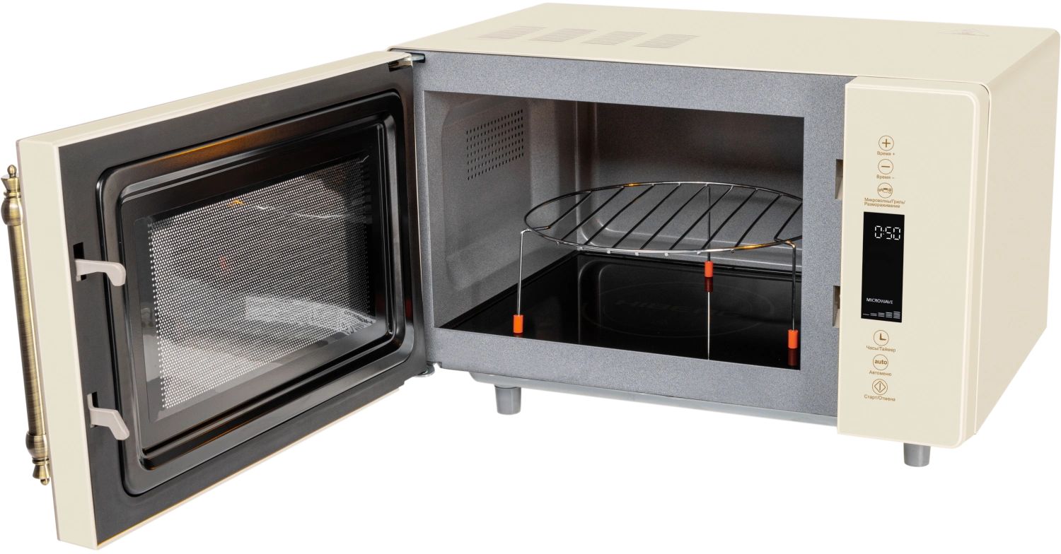 - Микроволновая печь выполнена в ретро дизайне, поэтому прекрасно впишется в интерьер кухни в классическом стиле, кантри или Прованс. Фасад микроволновой печи выполнен полностью из закаленного стекла бежевого цвета. Удобная металлическая ручка выгодно подчеркивает цвет и фактуру модели.