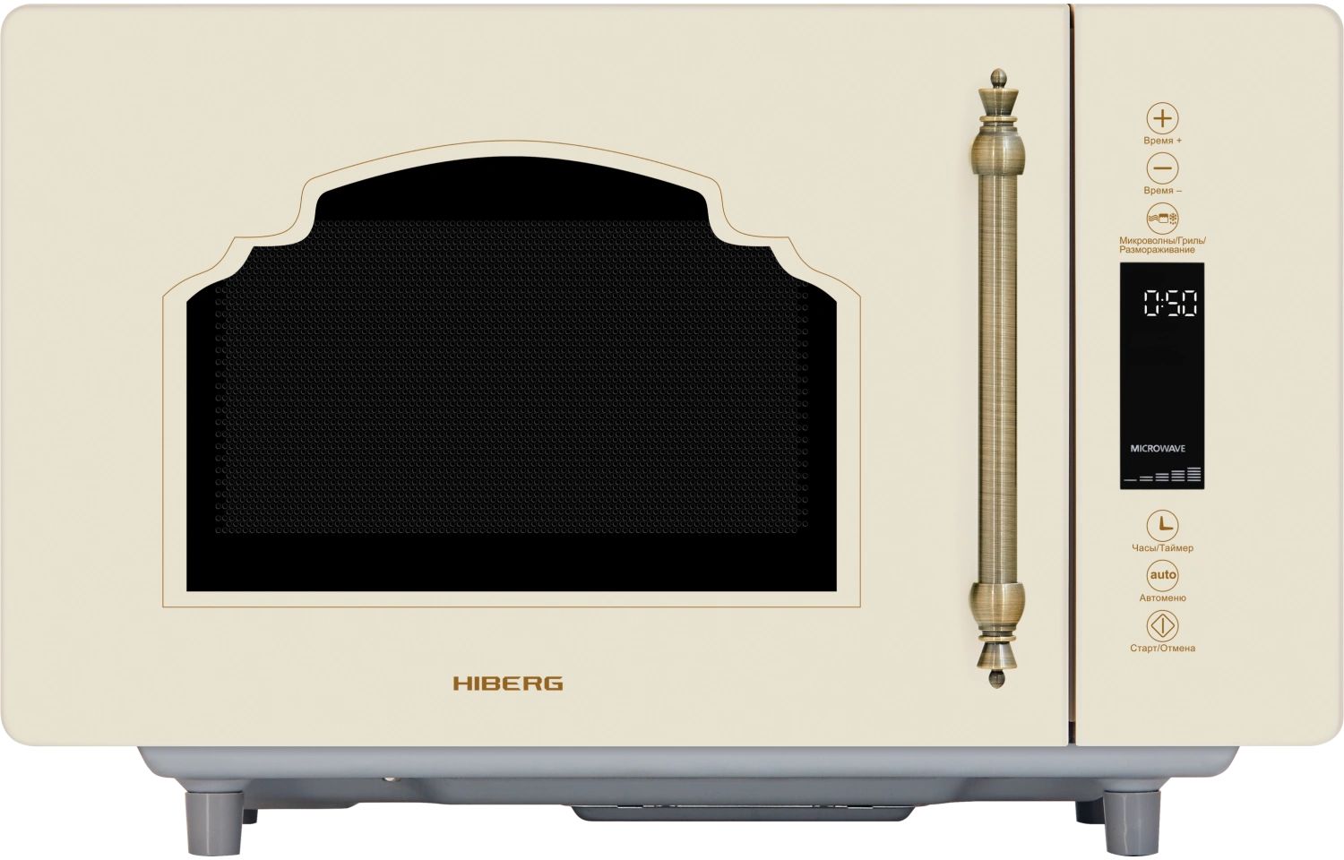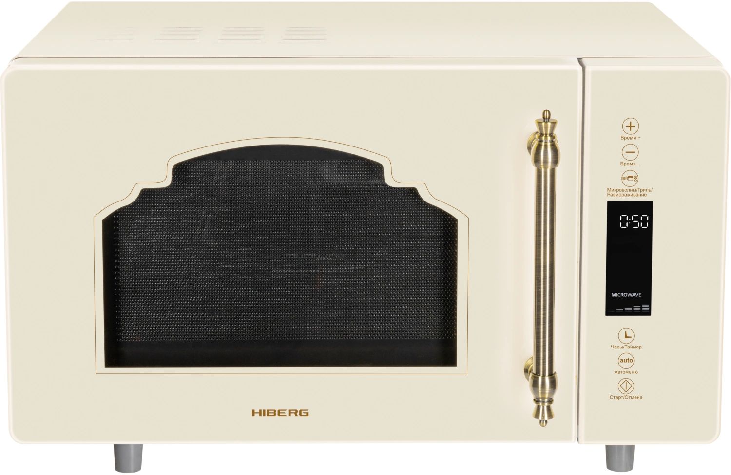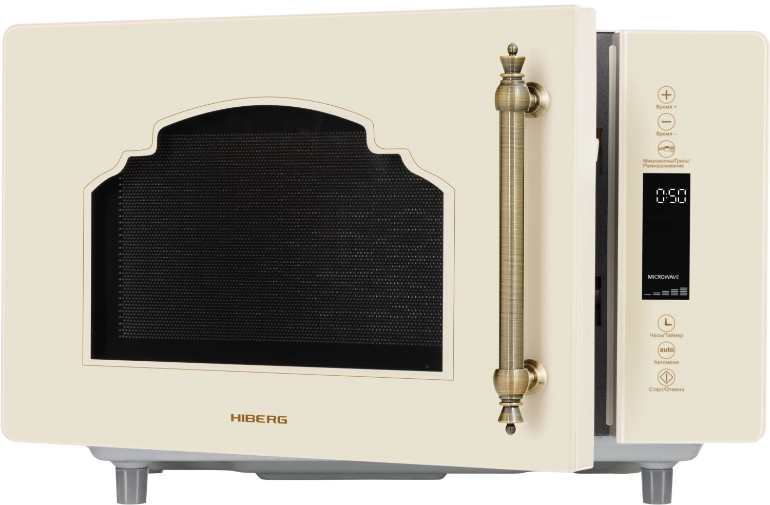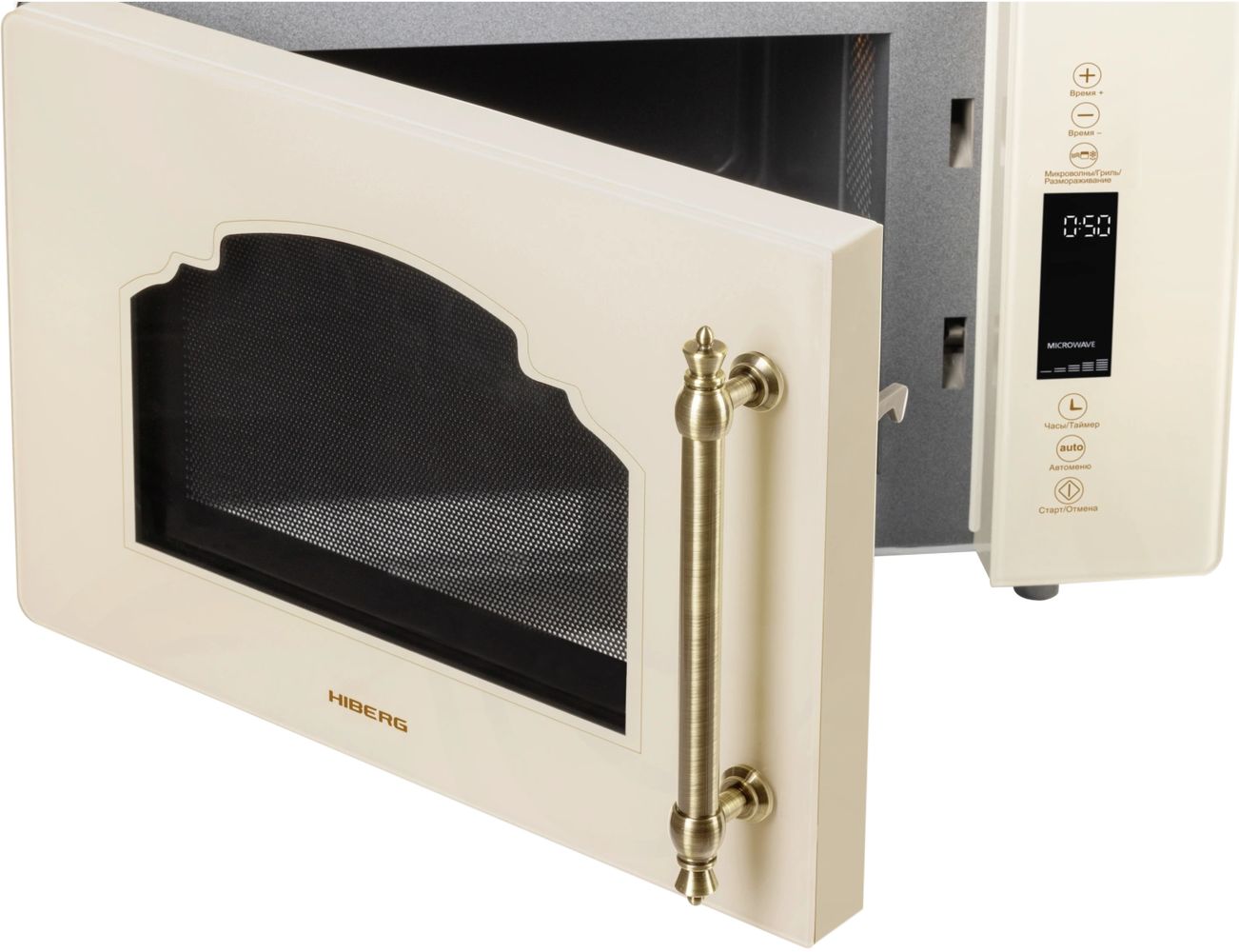 - Микроволновая печь выполнена в ретро дизайне, поэтому прекрасно впишется в интерьер кухни в классическом стиле, кантри или Прованс. Фасад микроволновой печи выполнен полностью из закаленного стекла бежевого цвета. Удобная металлическая ручка выгодно подчеркивает цвет и фактуру модели.