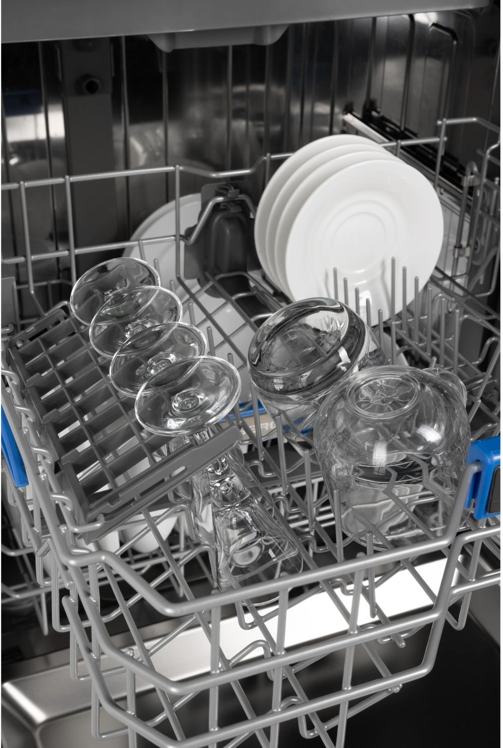 - Три вместительные корзины позволяют легко разместить как мелкую, так и крупногабаритную посуду. Одна из корзин регулируется по высоте, чтобы освободить место для кастрюль или высоких бокалов. Встроенная подсветка делает загрузку и выгрузку удобной и приятной.