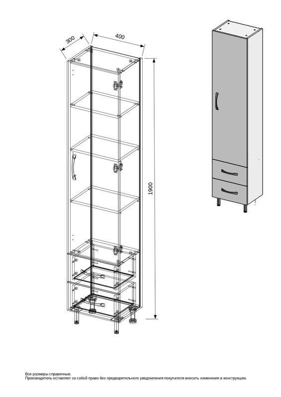 В пенале предусмотрено три полочки за распашной дверью и два ящика на направляющих полного выдвижения. Дверь пенала можно перевесить на любую нужную сторону — справа или слева. Для удобства организации хранения две полочки регулируются по высоте. Корпус выполнен из ЛДСП, фасад - из МДФ в пленке ПВХ. Универсальный пенал "Ника" входит в коллекции "Ника" в 50-75 размерах