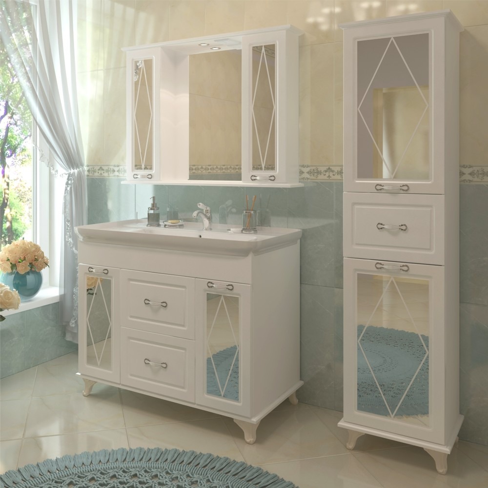 Новая классическая коллекция мебели Victoria визуально расширяет пространство ванной комнаты, благодаря наличию зеркал как на дверках тумбочки и зеркального шкафа, так и на пенале. Вместительные отделения пенала позволят хранить необходимые вещи. Белое исполнение коллекции впишется в любой интерьер Вашей ванной комнаты.