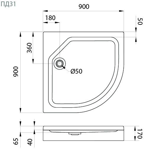Душевой поддон Тритон, размер 900х900х170 мм, диаметр слива 50 мм, материал акрил, цвет белый.