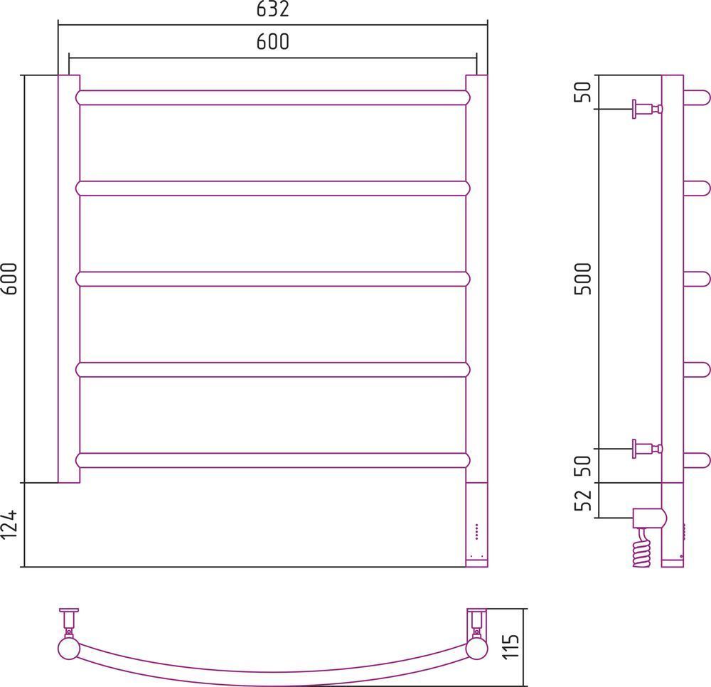 Полотенцесушитель электрический Сунержа Галант 3.0, размер 600х600 мм, 5 перекладин. Мощность 300 Вт, цвет сатин. Скрытое подключение.