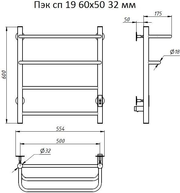 Полотенцесушитель электрический Тругор Пэксп19, 4 перекладины, мощность 60 Вт. Подключение левое или правое. Возможность скрытого подключения.