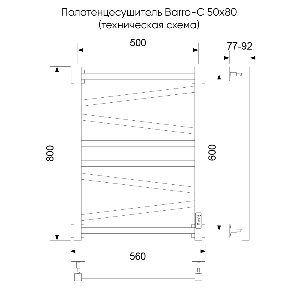 Полотенцесушитель электрический Veconi Barro-C B8050B-C, размер 500х800 мм, 8 перекладин, мощность 138 Вт. Скрытое подключение. Цвет чёрный.