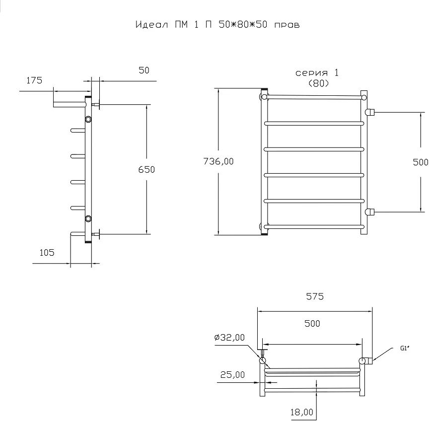 Полотенцесушитель водяной Тругор Идеал ПМ1 с полкой и боковым подводом П6 500х800 мм R (м/о 500 мм) 00-00026993