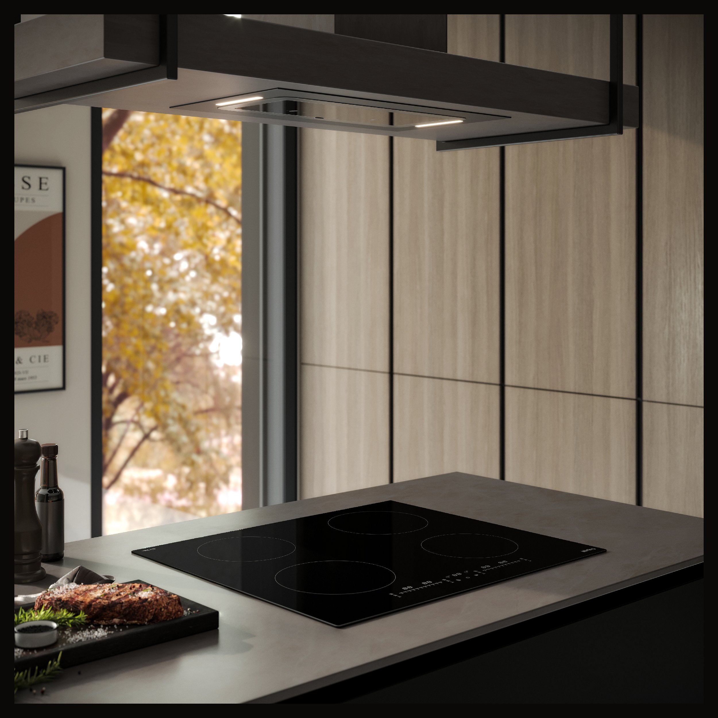 Индукционная варочная панель HI 64090 HID, выполненная из прочной стеклокерамики черного цвета и оснащенная четырьмя конфорками, имеет ширину 59 см. Панель управления варочной поверхностью загорается и гаснет только при нажатии кнопки включения прибора, что вместе с отсутствием лишних элементов, придает ей минималистичный и современный дизайн. Варочная поверхность предлагает 9 уровней мощности и оснащена сенсорным слайдерным управлением. Возможность сопряжения с соответствующей кухонной вытяжкой позволяет управлять и автоматически изменять скорость работы вытяжки в зависимости от выбранного уровня мощности варочной поверхности. Удобство и наглядность управления зонами нагрева обеспечиваются двумя отдельными дисплеями — для левой и правой зон. Функция Booster позволяет временно увеличить мощность нагрева на 30%. Возможность временно остановить нагрев, сохраняя все заданные настройки, обеспечивается благодаря функции Stop&Go. Электронный таймер помогает установить время приготовления, после которого панель автоматически отключится. Встроенный датчик контролирует температуру внутри варочной поверхности, и в случае обнаружения слишком высокой температуры работа панели будет прекращена. Автоматическое отключение срабатывает, если пользователь забыл отключить оборудование. Для еще большей безопасности предусмотрена функция «Защита детей», при которой панель управления блокируется, исключая возможность случайного включения прибора.