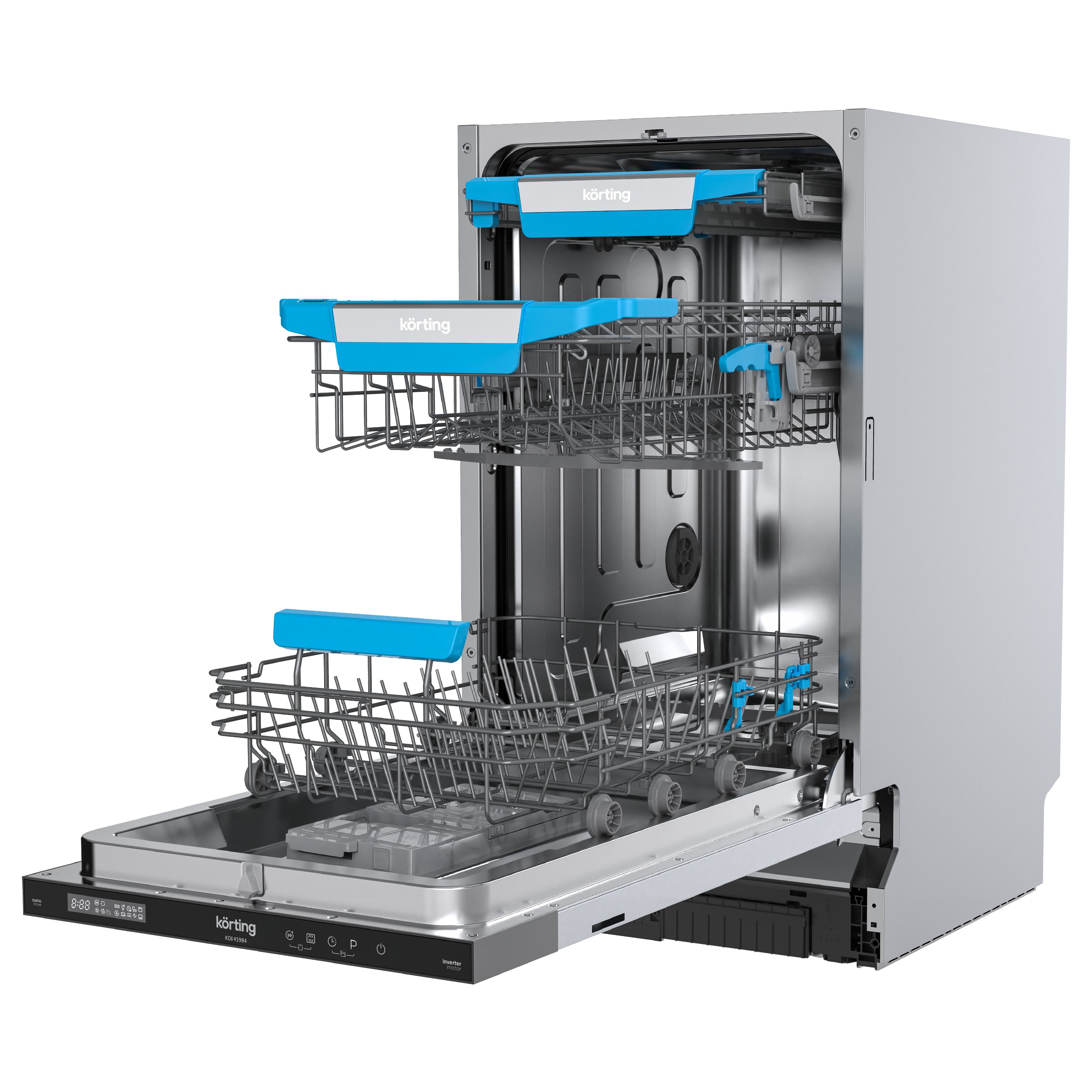 Посудомоечная машина KDI 45984 — это встраиваемая бытовая техника шириной 45 см, которая станет незаменимым помощником на кухне. Модель оснащена тремя корзинами, включая выдвижную корзину для столовых приборов «C-Shelf», что обеспечивает удобное размещение и легкий доступ к столовым предметам. Специальная зона для мойки бутылок и стаканов с регулируемыми держателями надежно фиксирует посуду во время мойки, предотвращая её падение и повреждения. Направляющие для корзин с шарикоподшипниками Easy Glide обеспечивают плавное движение корзин при загрузке и выгрузке посуды, что значительно упрощает организацию пространства внутри машины. Внутреннее LED-освещение камеры добавляет комфорта и позволяет контролировать чистоту внутри прибора. Машина предлагает восемь программ мойки, включая автоматическую, каждая из которых позволяет подобрать оптимальный режим в зависимости от поставленной задачи. Автоматическое дозирование жидкого моющего средства точно рассчитывает необходимое количество для каждого цикла мойки в зависимости от выбранной программы и уровня загрязнения посуды. Модель также поддерживает комбинированные моющие средства в одной таблетке «All in 1». Инверторный мотор, которым оснащен прибор, является высокотехнологичным решением, обеспечивающим тихую (42 Дб) и эффективную работу. Он отличается долговечностью и надежностью, что гарантирует стабильную эксплуатацию и высокое качество мойки. Посудомоечная машина KDI 45984 оборудована современной системой защиты от протечек AquaControl, благодаря которой осуществляется контроль количества воды и блокируется ее подача в случае перелива или протечек. Сенсорное управление Touch Control делает процесс эксплуатации простым и интуитивно понятным. Функция отложенного старта (1-24 часа) позволяет легко спланировать мойку на удобное время, а функция автооткрывания дверцы в конце цикла мойки способствует естественному высыханию посуды, предотвращая образование конденсата.