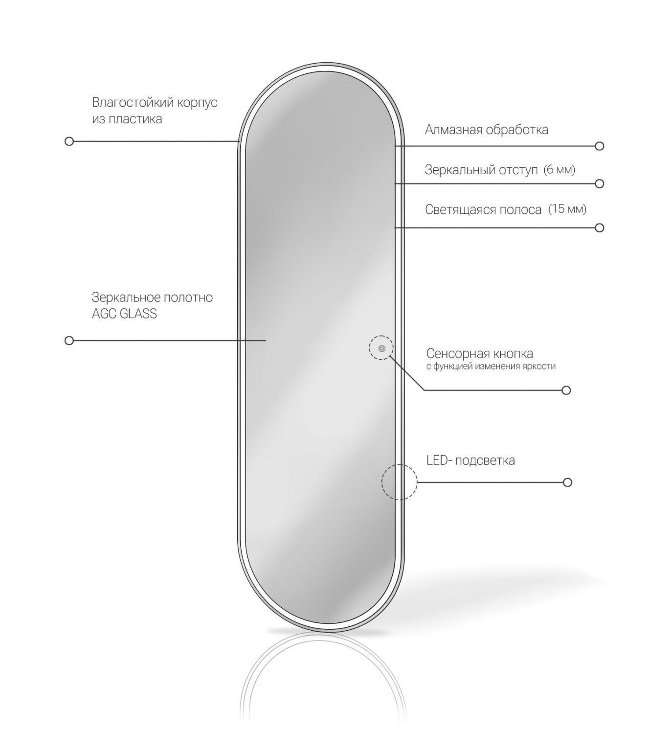 - Зеркало влагостойкое , оснащенное светодиодной LED подсветкой с диммером и сенсорным выключателем .