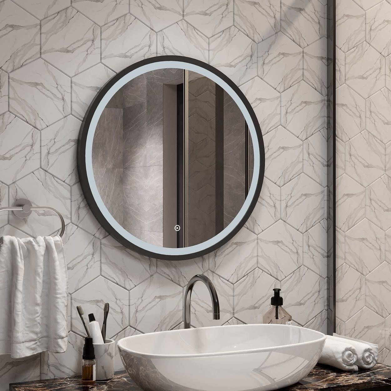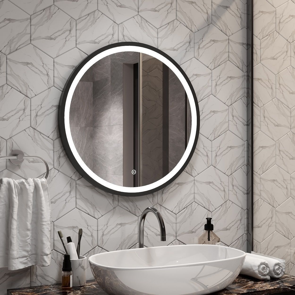 - Круглое зеркало для ванной комнаты оснащенное светодиодной подсветкой с диммером и сенсорным выключателем .