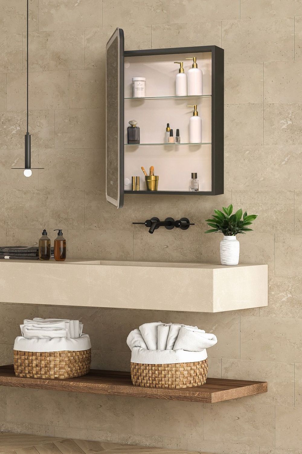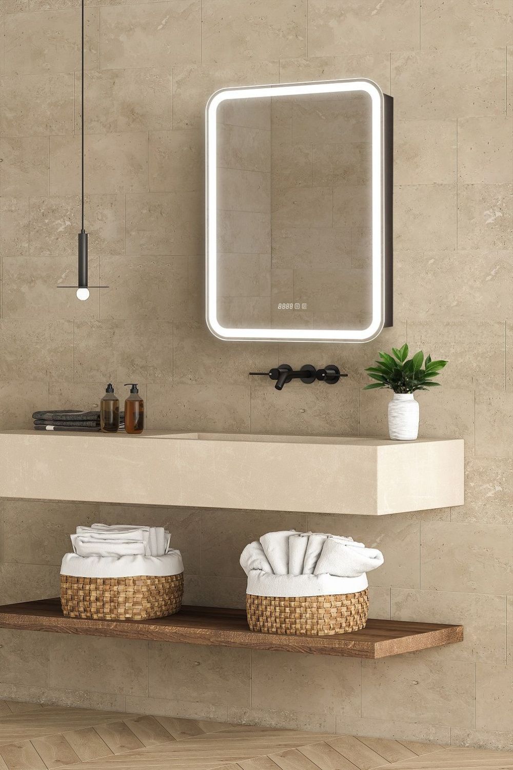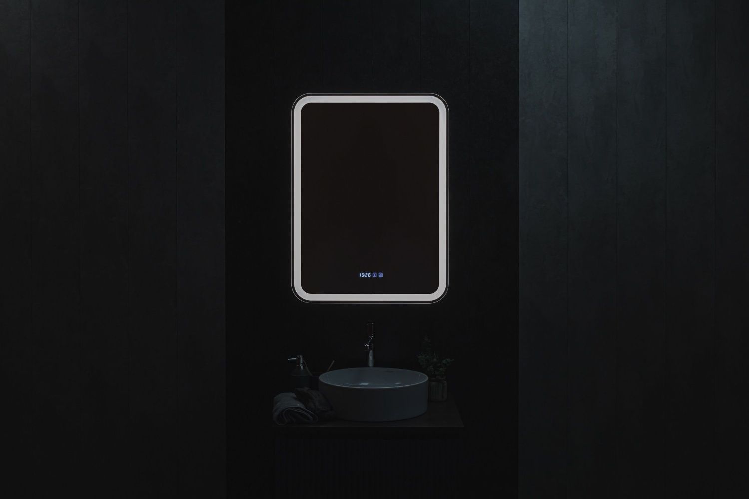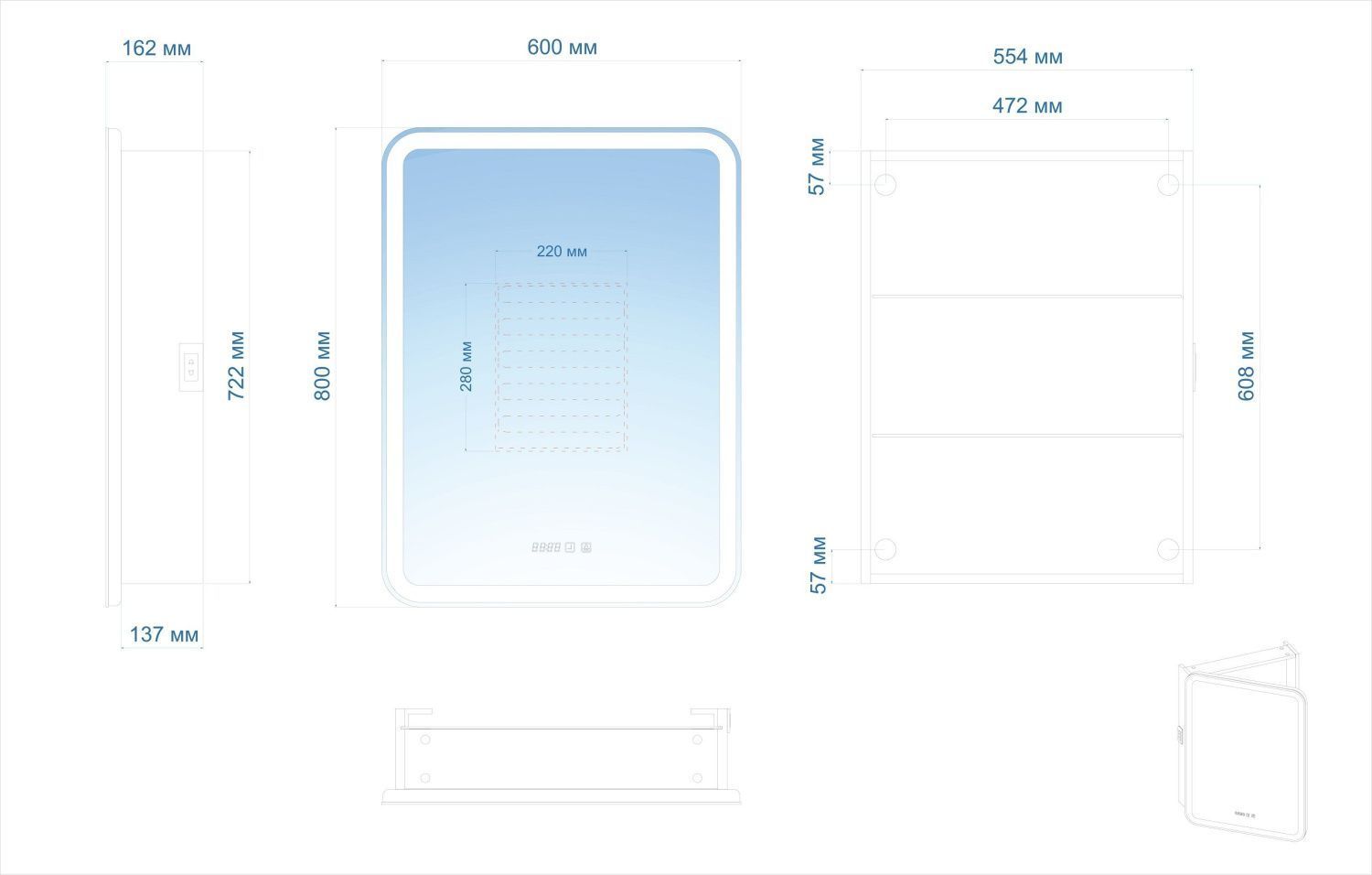 - Зеркало-шкаф, оснащенное светодиодной LED подсветкой с диммером, часами и функцией антизапотевания