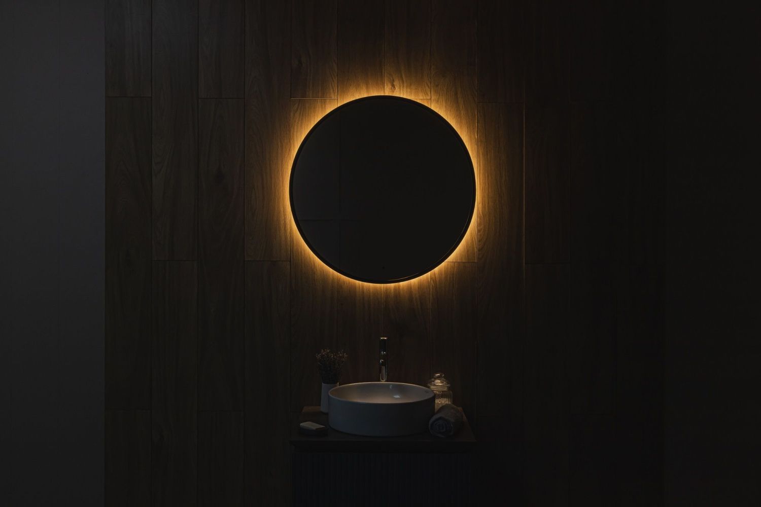 - Ореольная подсветка подчеркивает форму зеркала и создает эффект парения.