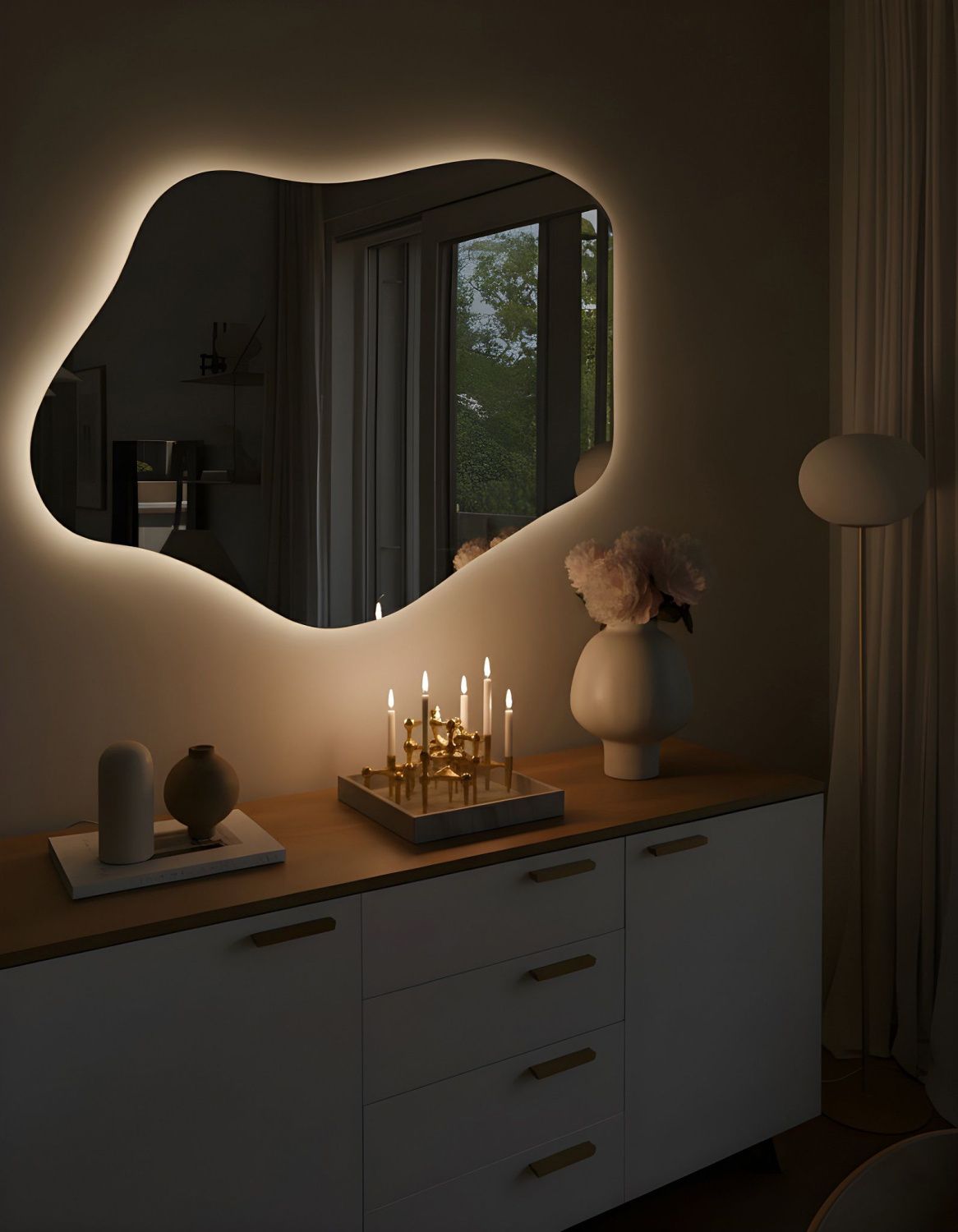 - Ореольная подсветка подчеркивает форму зеркала и создает эффект парения.