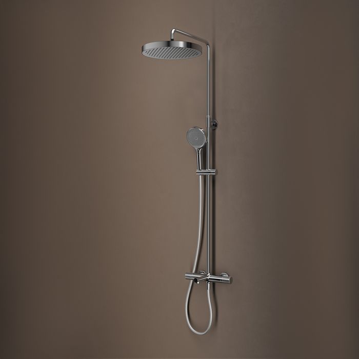 - Душевая система с термостатом, тропическим и ручным душем и изливом Duna – воплощение актуальных трендов в дизайне смесителей в безупречном исполнении: фрезеровка, модные цвета и фактуры.