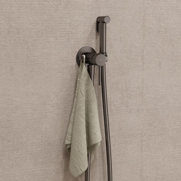 - Встраиваемый смеситель с гигиеническим душем Axes в трендовом матовом графитовом оттенке – практичный и стильный, его дизайн сочетает в себе трендовый минимализм форм и четкие грани. Имеет крючок для полотенца, который можно установить как слева, так и справа. Гладкий душевой шланг 1,2 м в комплекте.