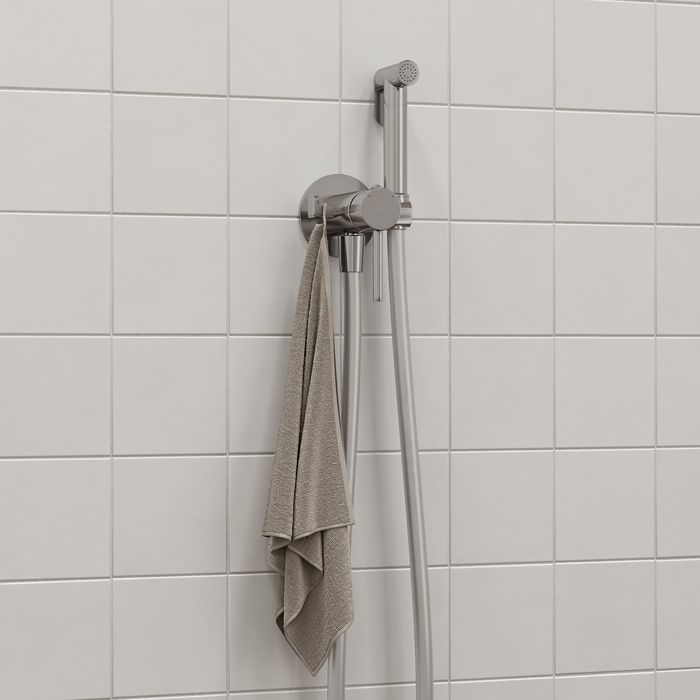 - Встраиваемый смеситель с гигиеническим душем Axes в стильном оттенке матового хрома – практичный и стильный, его дизайн сочетает в себе трендовый минимализм форм и четкие грани. Имеет крючок для полотенца, который можно установить как слева, так и справа. Гладкий душевой шланг 1,2 м в комплекте.