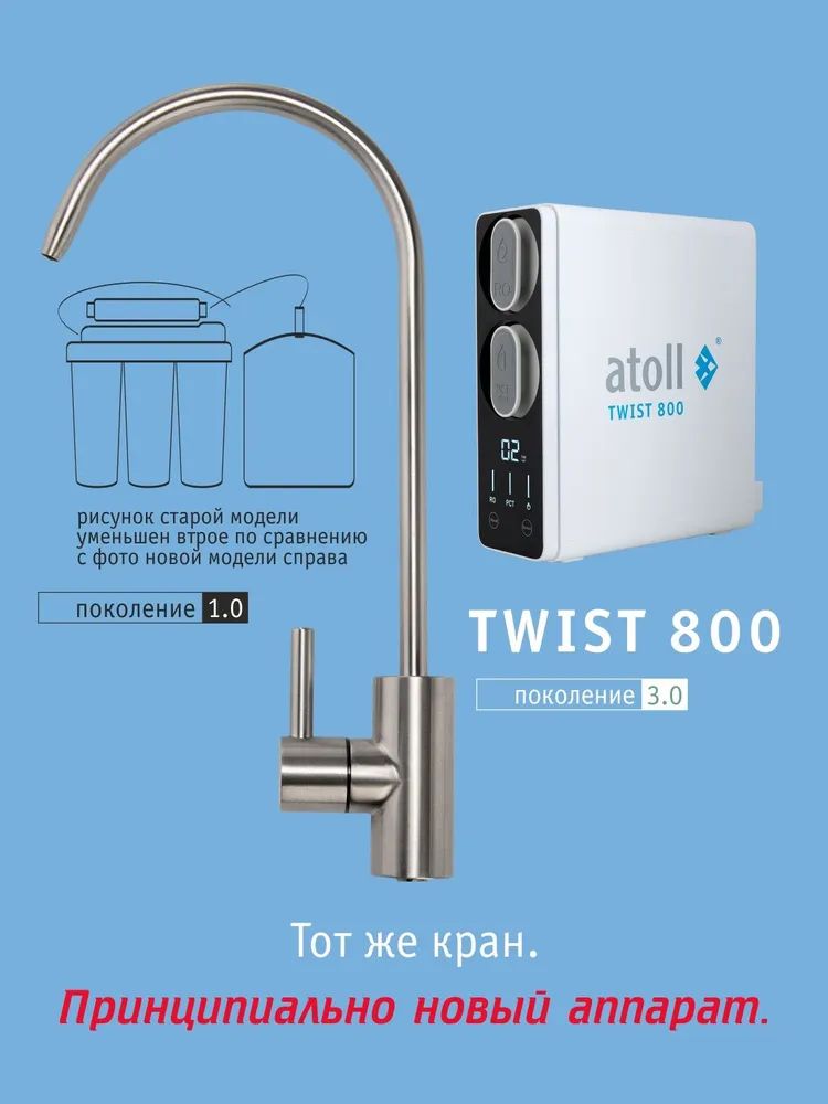 - Сверхмощная обратноосмотическая мембрана atoll 800 TWIST производит в минуту более 2-х литров чистой питьевой воды.