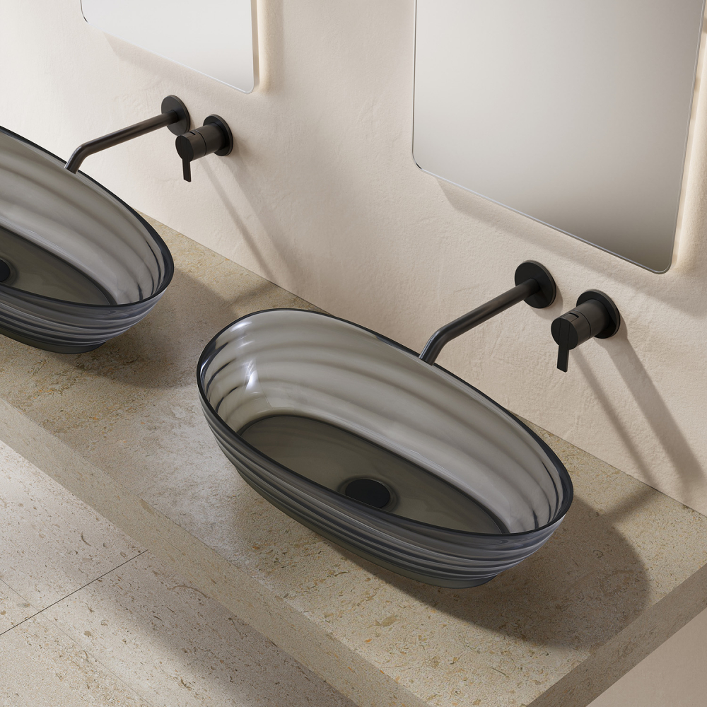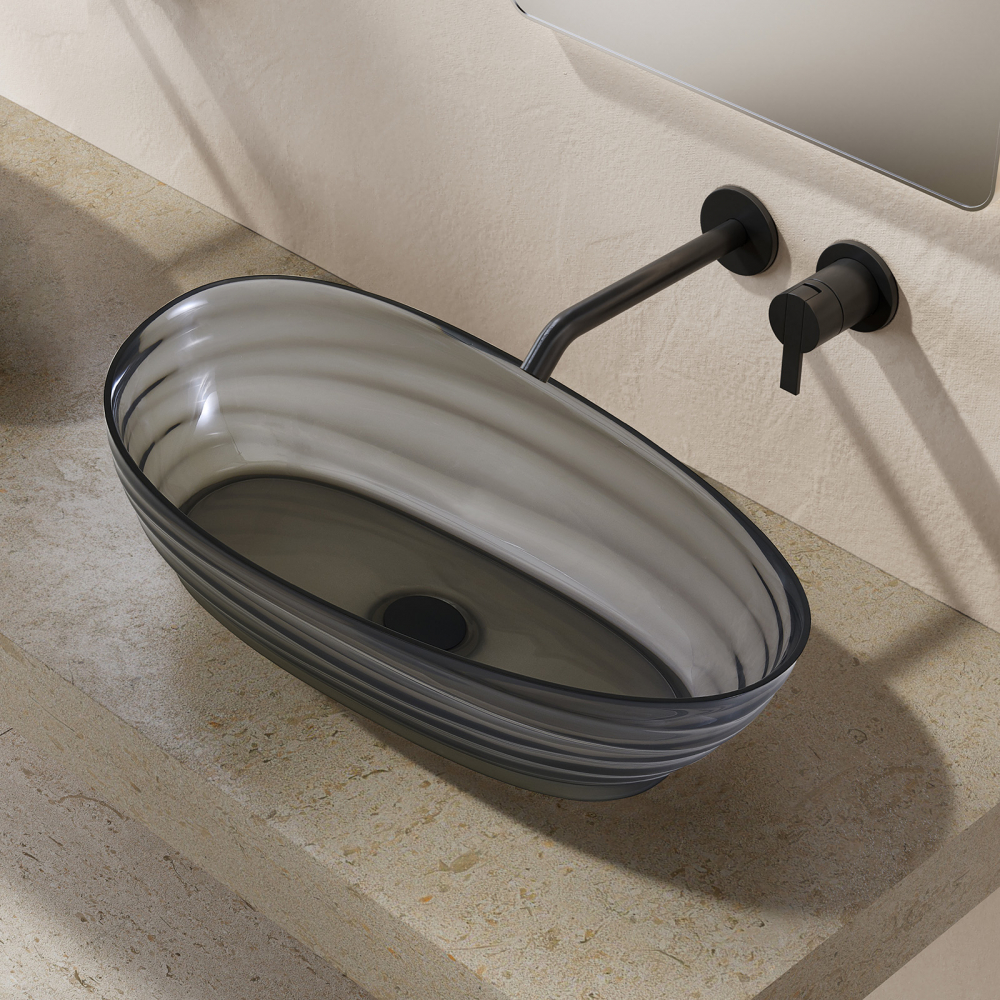 Раковина притягивает взгляд необычной игрой света — полупрозрачный материал мягко рассеивает лучи, а контрастный черный цвет добавляет пространству глубину и драматизм. В отличие от традиционной керамики, изделие выглядит как художественный объект, при этом сохраняет все функциональные преимущества сантехники. Накладной монтаж позволяет установить раковину на любую подходящую столешницу, экономя пространство и упрощая монтаж.