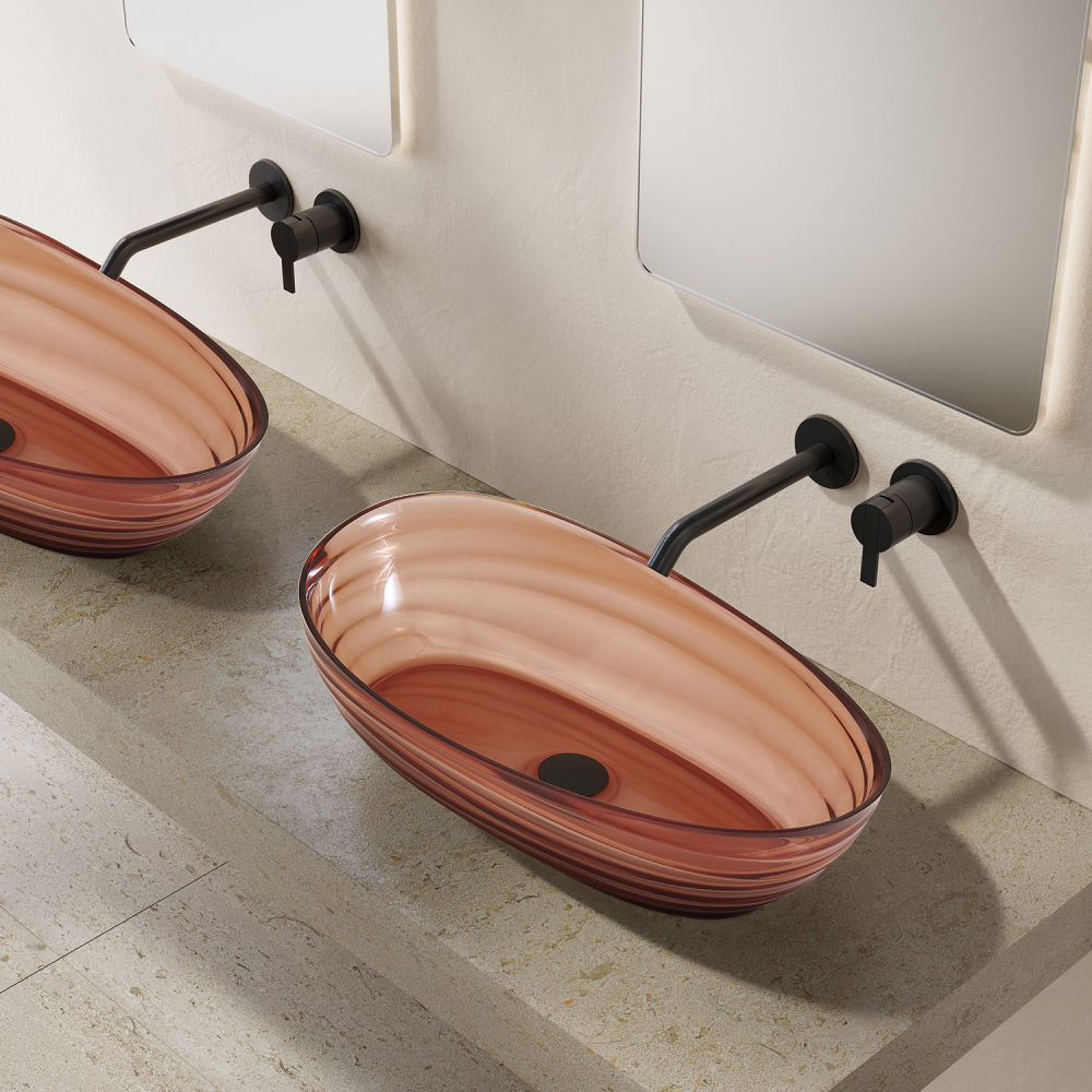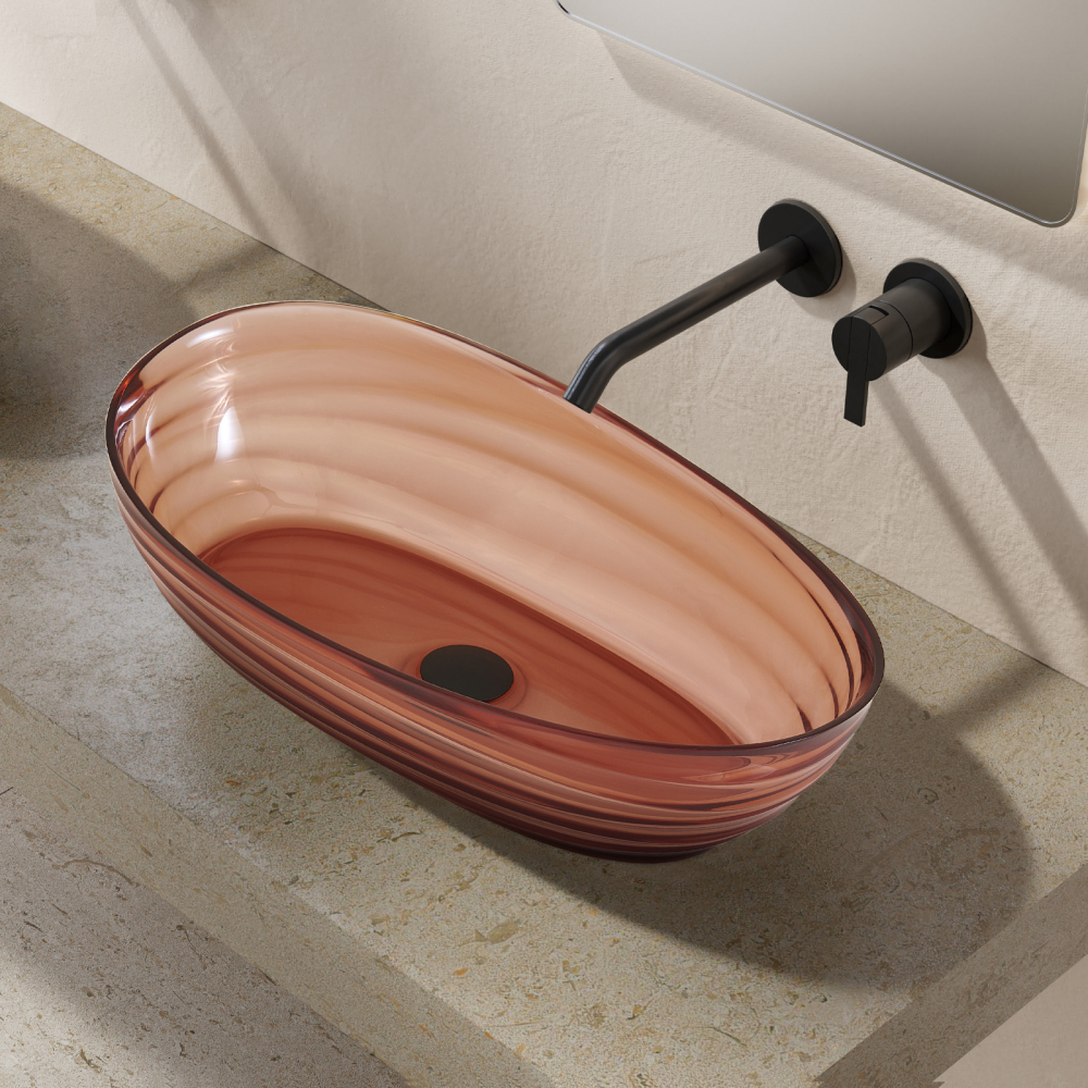 Раковина притягивает взгляд необычной игрой света — полупрозрачный материал мягко рассеивает лучи, подчёркивая насыщенный коричневый цвет. В отличие от традиционной керамики, изделие выглядит как художественный объект, при этом сохраняет все функциональные преимущества сантехники. Накладной монтаж позволяет установить раковину на любую подходящую столешницу, экономя пространство и упрощая монтаж.