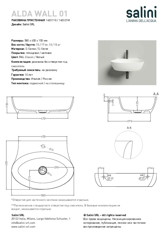 Раковина-чаша Salini Alda Wall 01 58 см 140311G (S-Sense) глянцевая