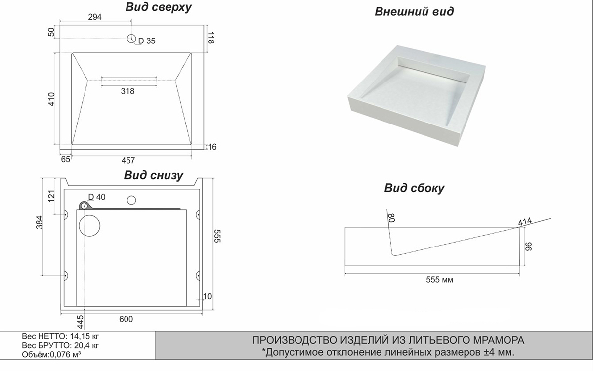 Раковины состоят из натурального молотого мрамора и полиэфирной смолы. Все изделия покрываются специальным гелькоутом - полимером повышенной прочности и химической стойкости, марки «ViaPal», который имеет сертификат для использования в медицинских учреждениях. Все раковины проходят термообработку в промышленной печи при температуре 80 °C, таким образом выводятся все вредные вещества. Каждая раковина доводится вручную и полируется, поэтому все изделия имеют безупречный внешний вид. Раковина комплектуется кронштейнами и сифоном.