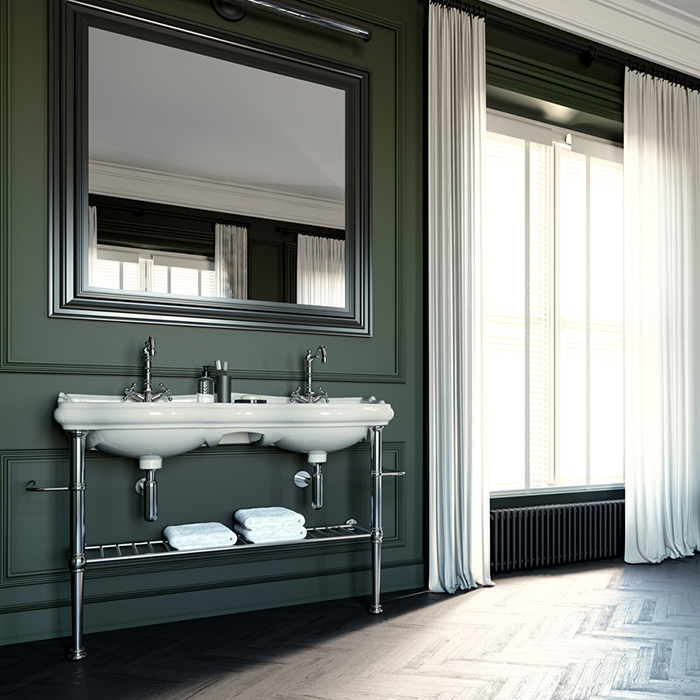 Раковина двойная с консолью Kerasan Retro 120 см, с полкой решеткой и двумя полотенцедержателями, цвет хром.