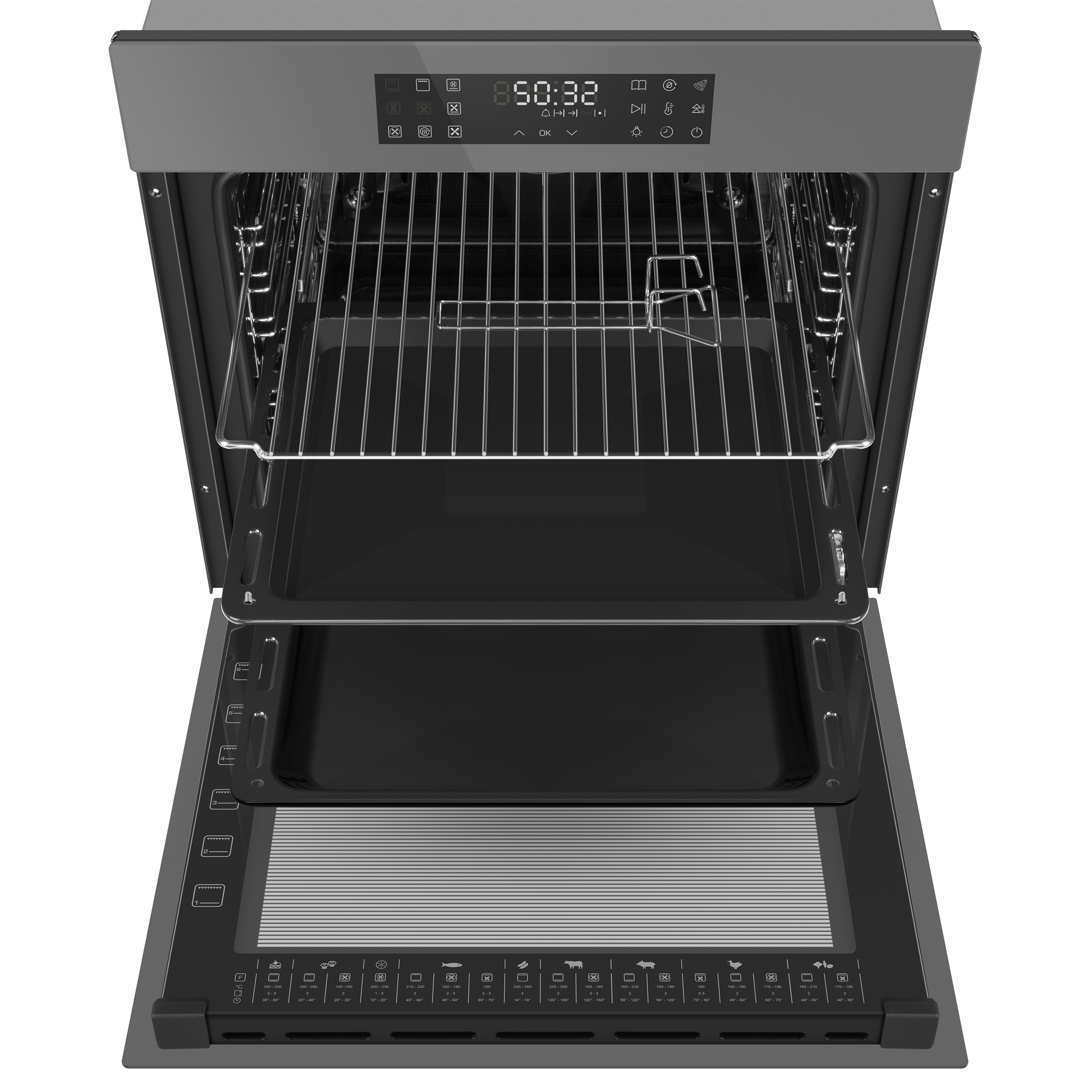 - Комплектация: Противень для выпечки, глубокий противень, прихват, хромированная решетка, 5ти уровневые хромированные направляющие, телескопические направляющие