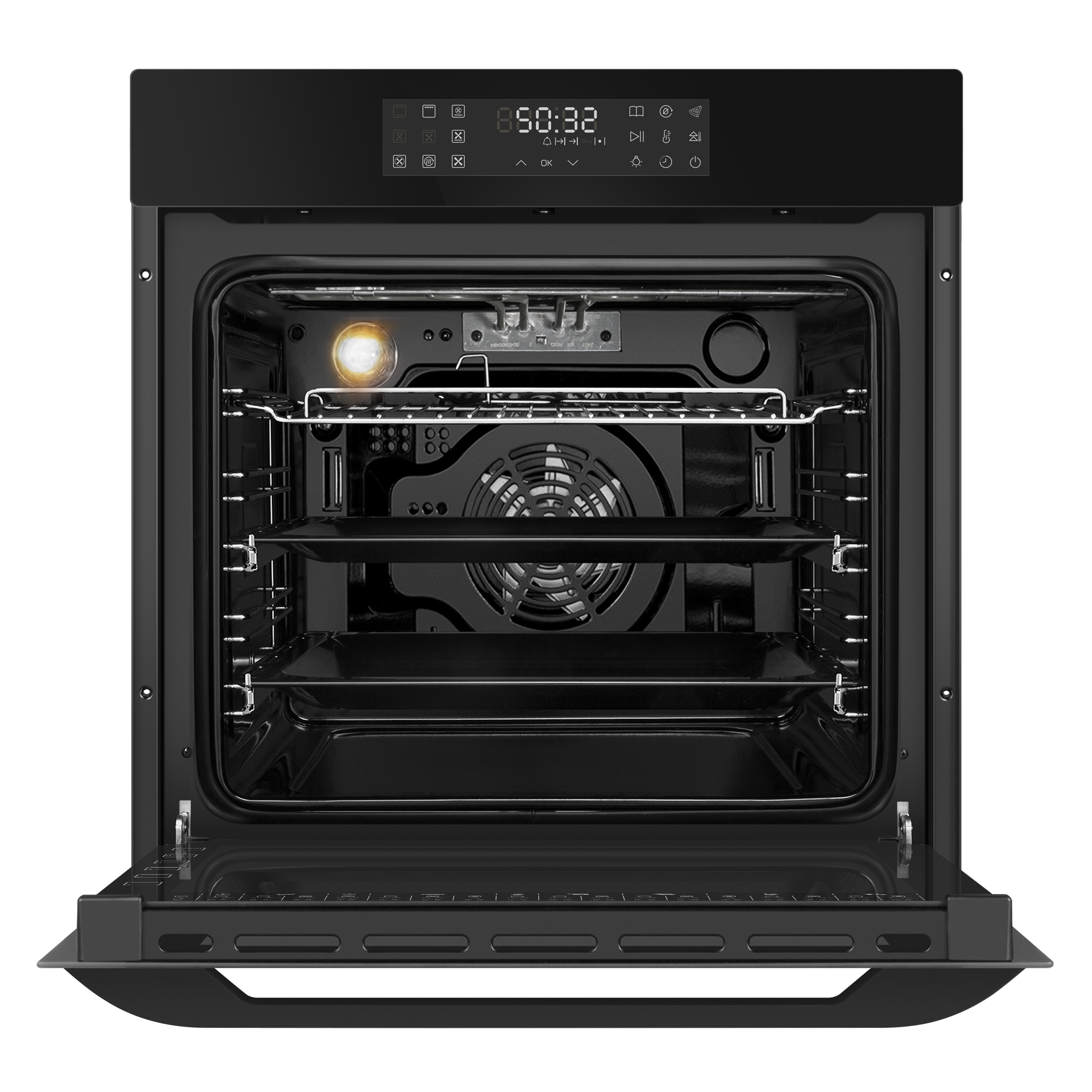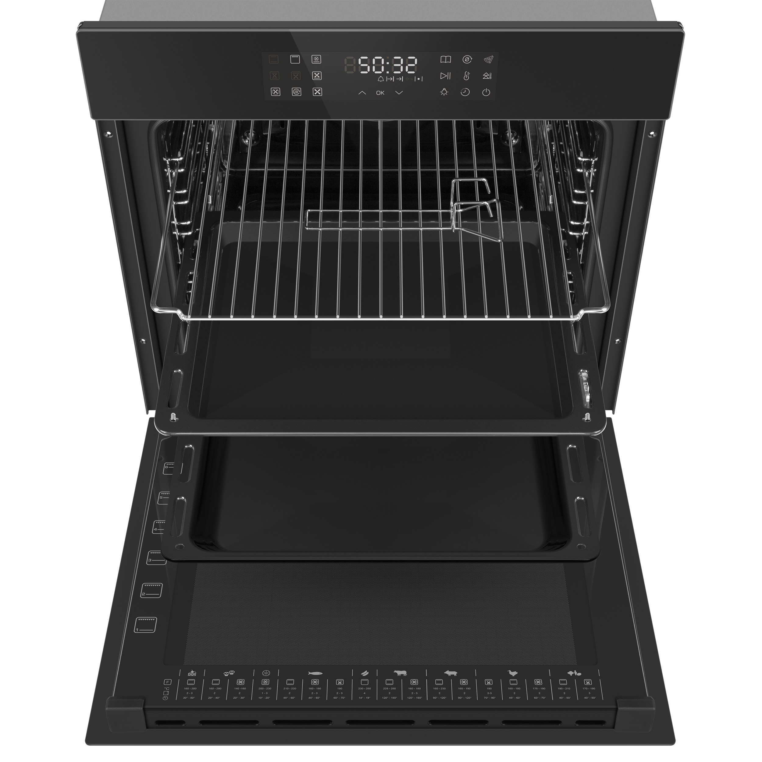 - Комплектация: противень для выпечки, глубокий противень, прихват, хромированная решетка, 5ти уровневые хромированные направляющие, телескопические направляющие