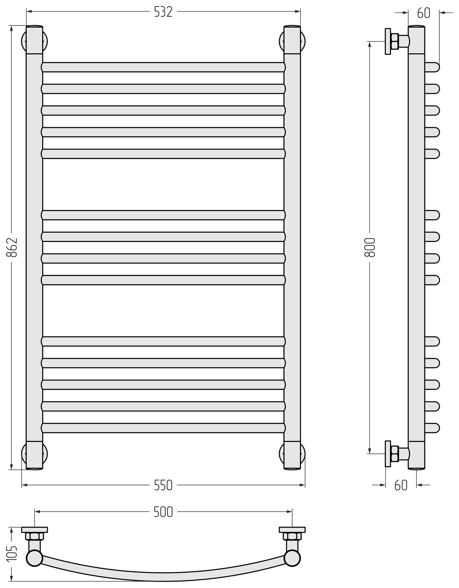 Полотенцесушитель водяной Сунержа Богема+ П14 500x860 мм (выгнутая перемычка) 051-0221-8050, состаренная латунь