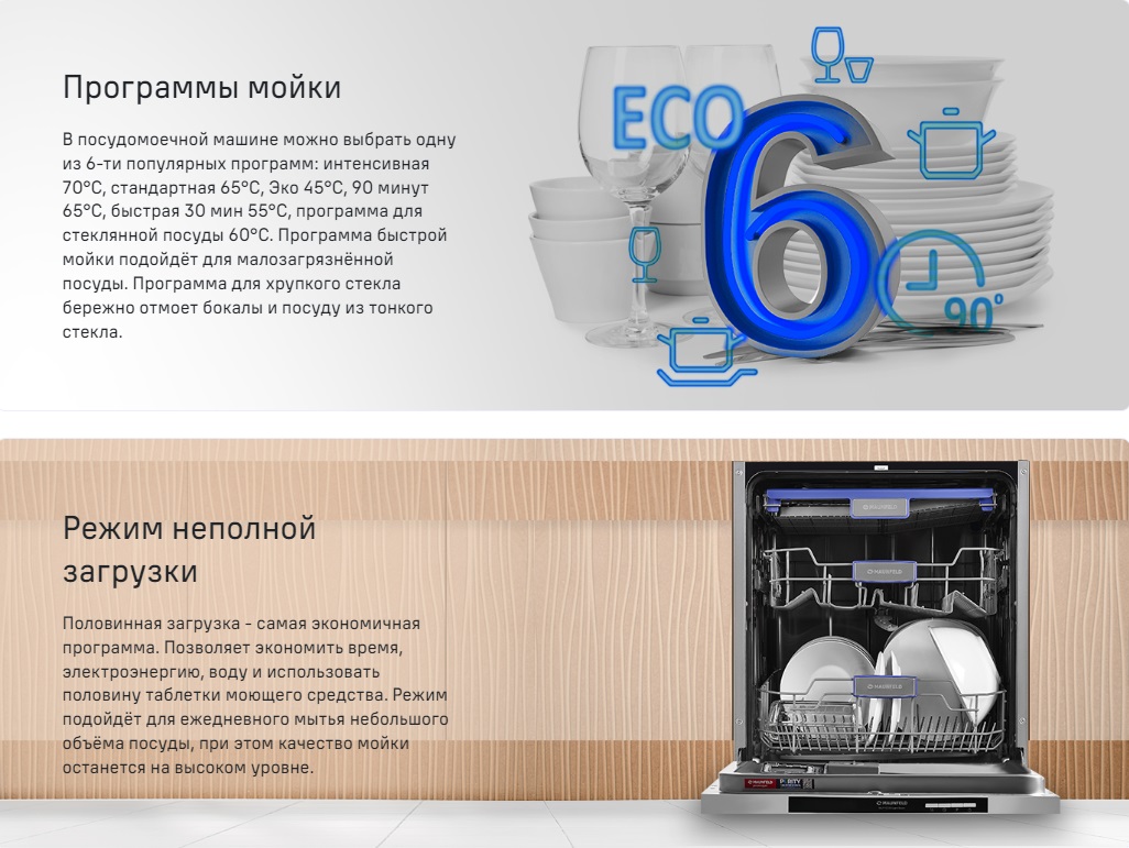 - Экономичная программа - для посуды с низким и средним уровнями загрязнения. Данный режим обеспечивает оптимальный расход воды и электроэнергии.