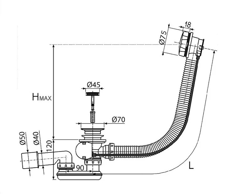 Слив-перелив полуавтоматический для ванны с внешним кабелем L=700мм, регулируемым сифоном, вентиль и клапан латунь, с гофротрубой, цвет хром.