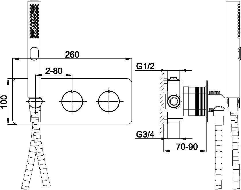 - для 2х потребителей воды, дополнительно приобретается оборудование на 2а потребителя (Пример: №1 верх.душ + №2 душевой набор с водорозеткой ИЛИ другие комбинации из 2х элементов)