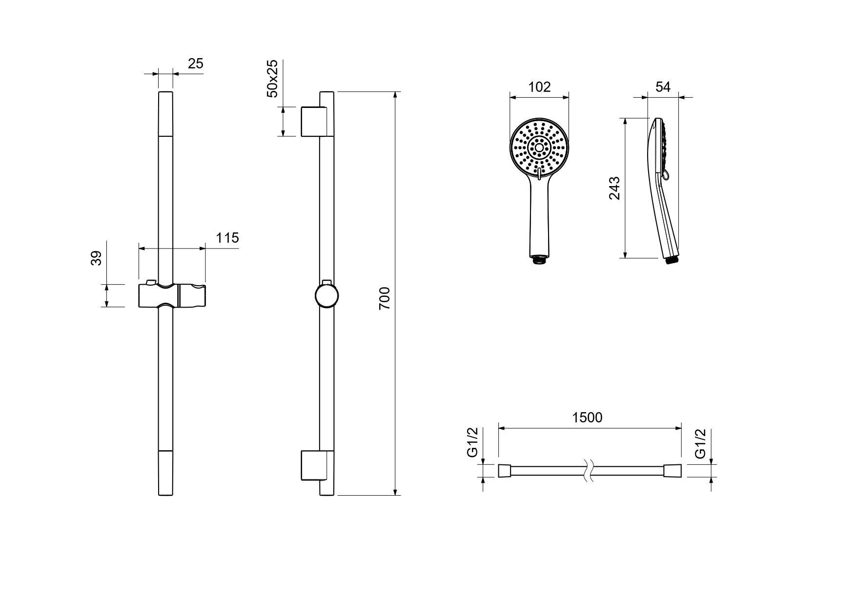 - В комплекте: душевая штанга; держатель душевой лейки; душевая лейка; душевой шланг; монтажный комплект