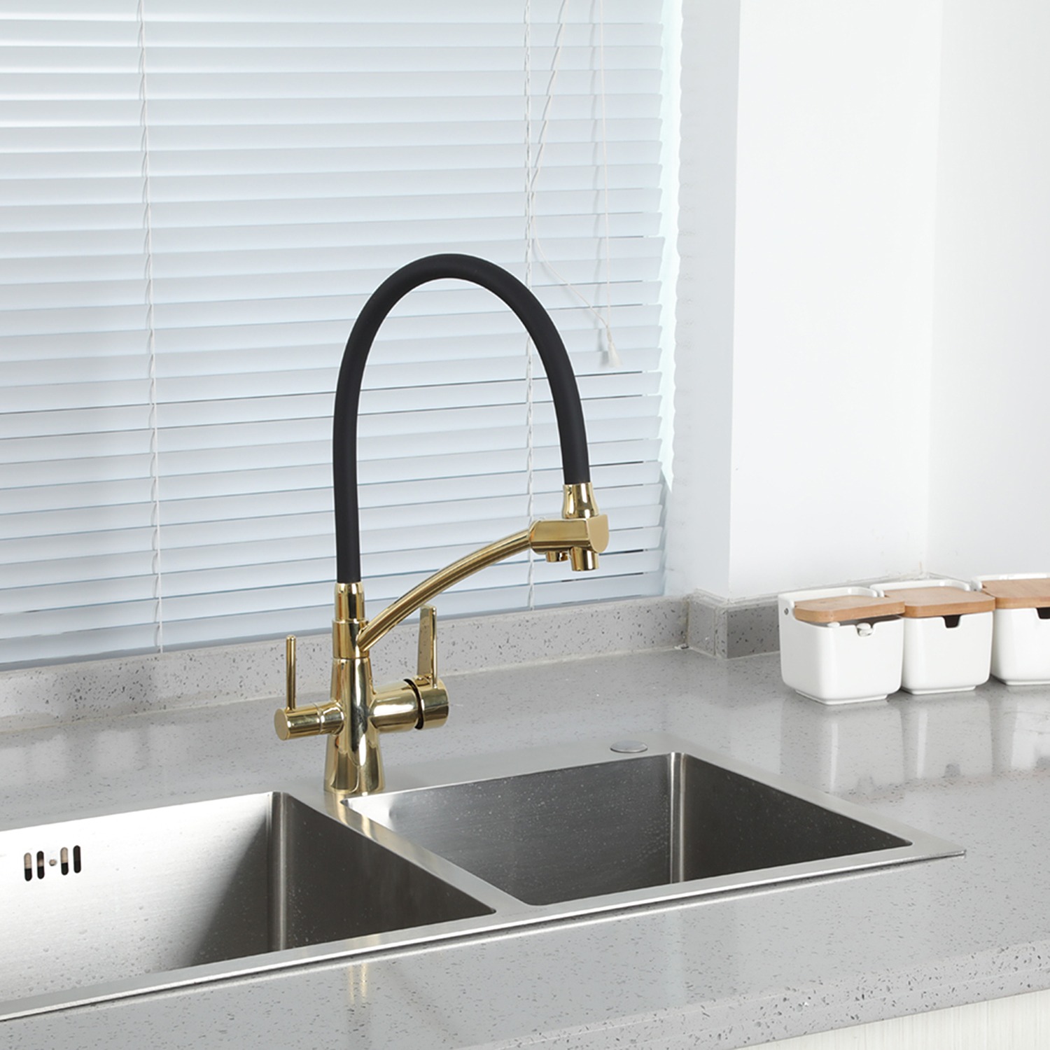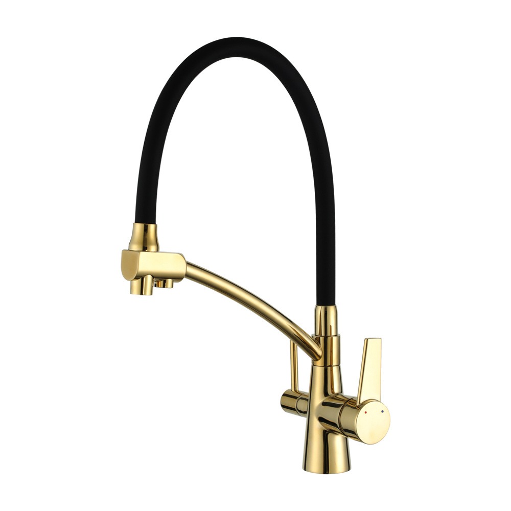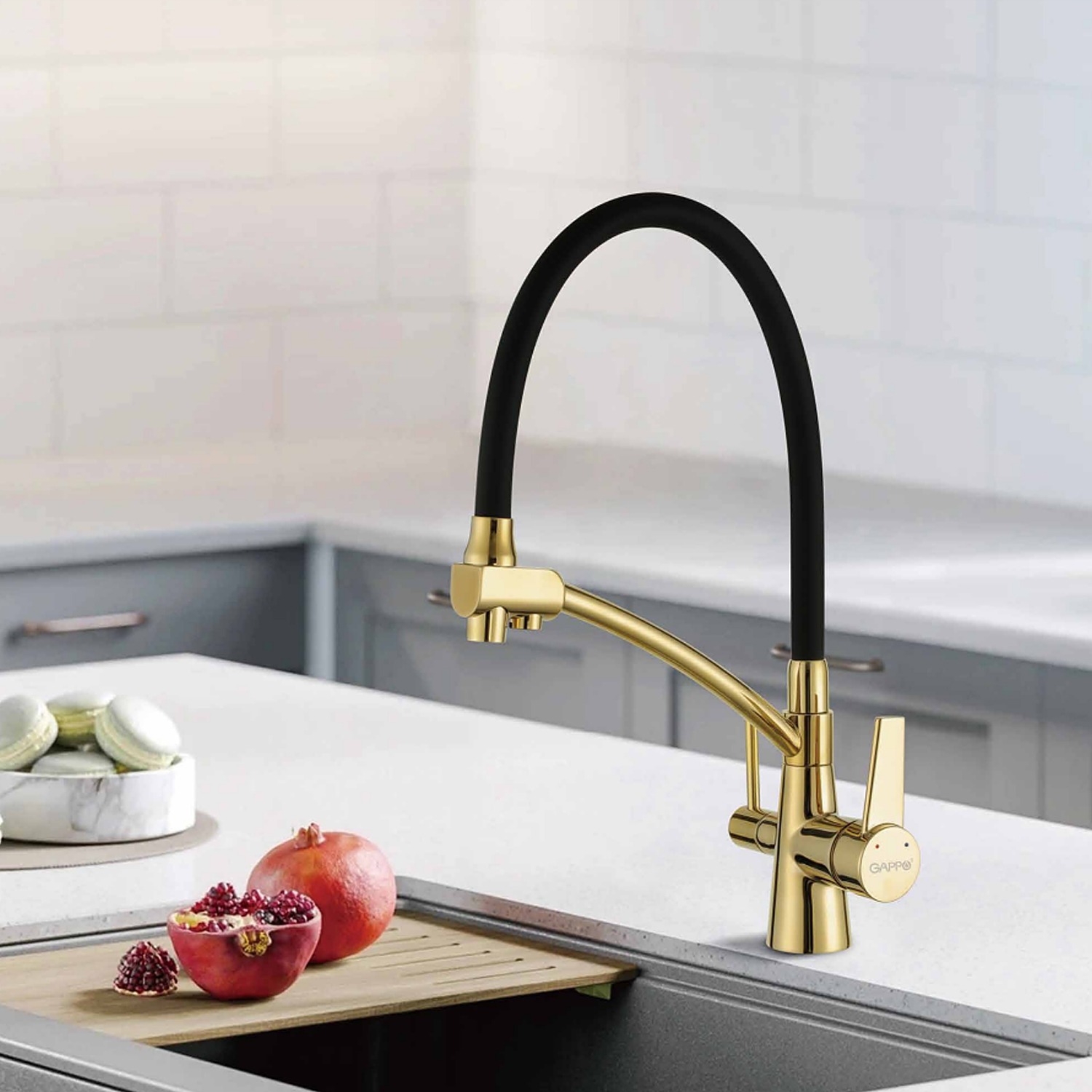 Смеситель для кухни Gappo G4398-13 с гибким изливом и подключением фильтра, материал - латунь, цвет - золото/черный.