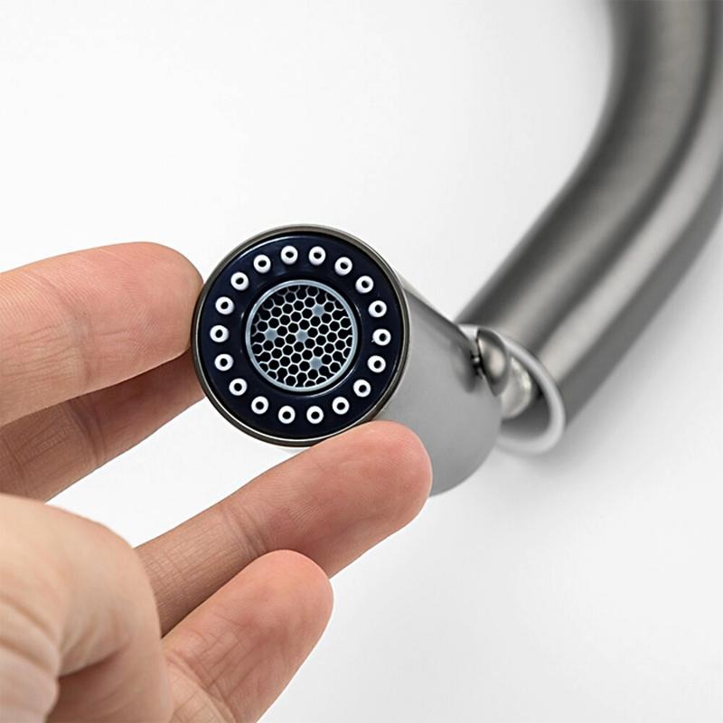 Главная особенность смесителя для кухни Gappo G4398-45 состоит в том, что у него в конструкции предусмотрена выдвижная лейка с режимом душ. С таким смесителем будет удобно наполнять большие емкости, мыть крупную посуду, овощи и фрукты. Чтобы переключаться между режимами на аэраторе есть специальная кнопка. Корпус из нержавеющей стали, цветовой оттенок сатин.