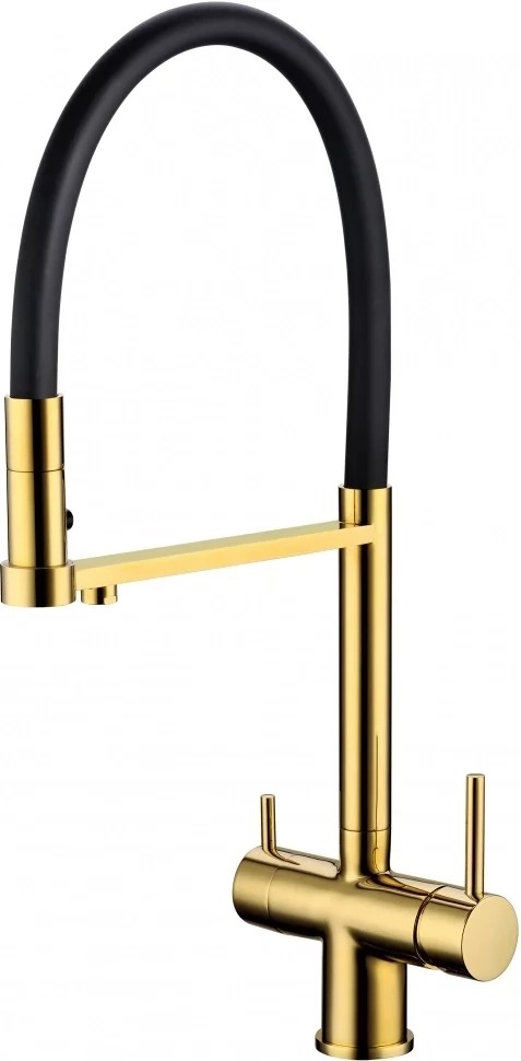 Смеситель для кухни Grocenberg GB4095GO с гибким изливом и подключением к фильтру питьевой воды, материал - латунь, цвет - золото.