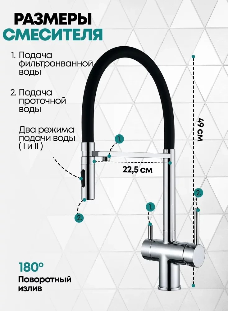 - Смеситель с подключением к фильтру и двумя режимами лейки.