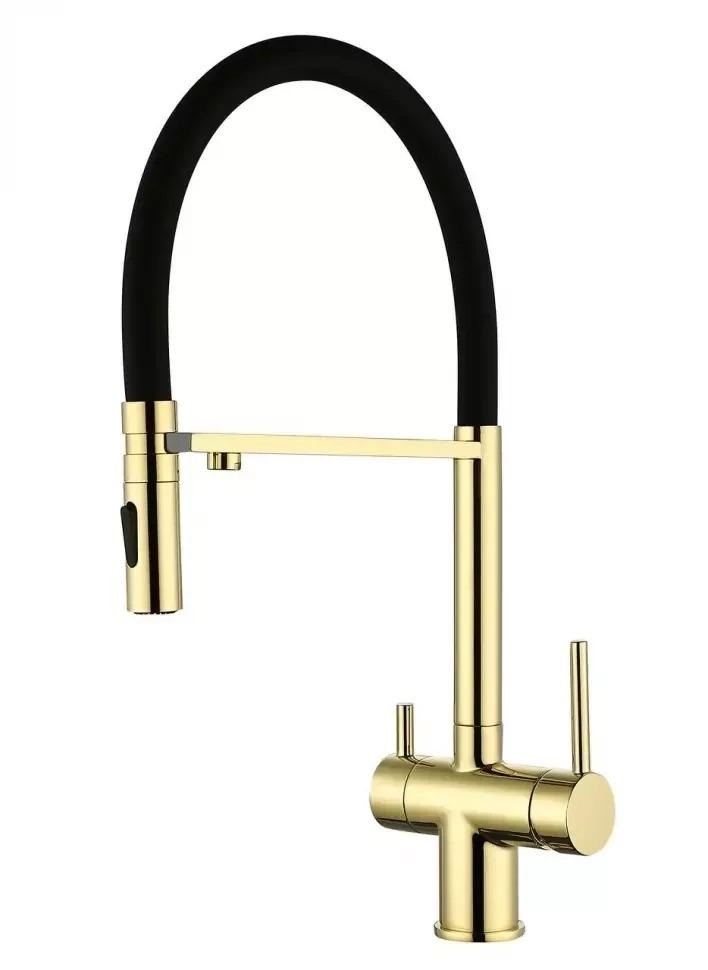 Смеситель для кухни Grocenberg GB4096GO с гибким изливом и подключением к фильтру питьевой воды, материал - латунь, цвет - золото.