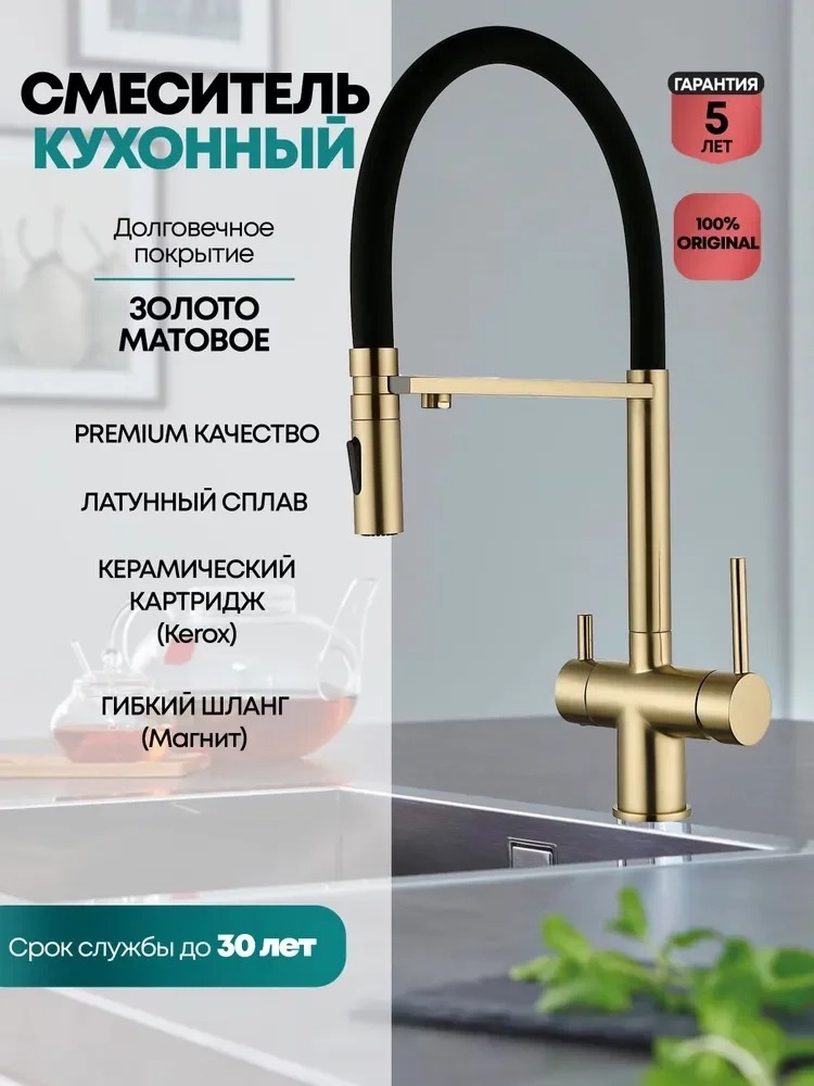 Смеситель для кухни Grocenberg GB4096MG с гибким изливом и подключением к фильтру питьевой воды, материал - латунь, цвет - матовое золото.