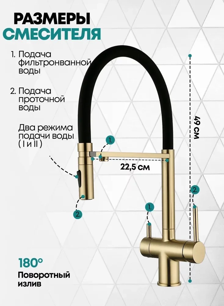 - Смеситель с подключением к фильтру и двумя режимами лейки.