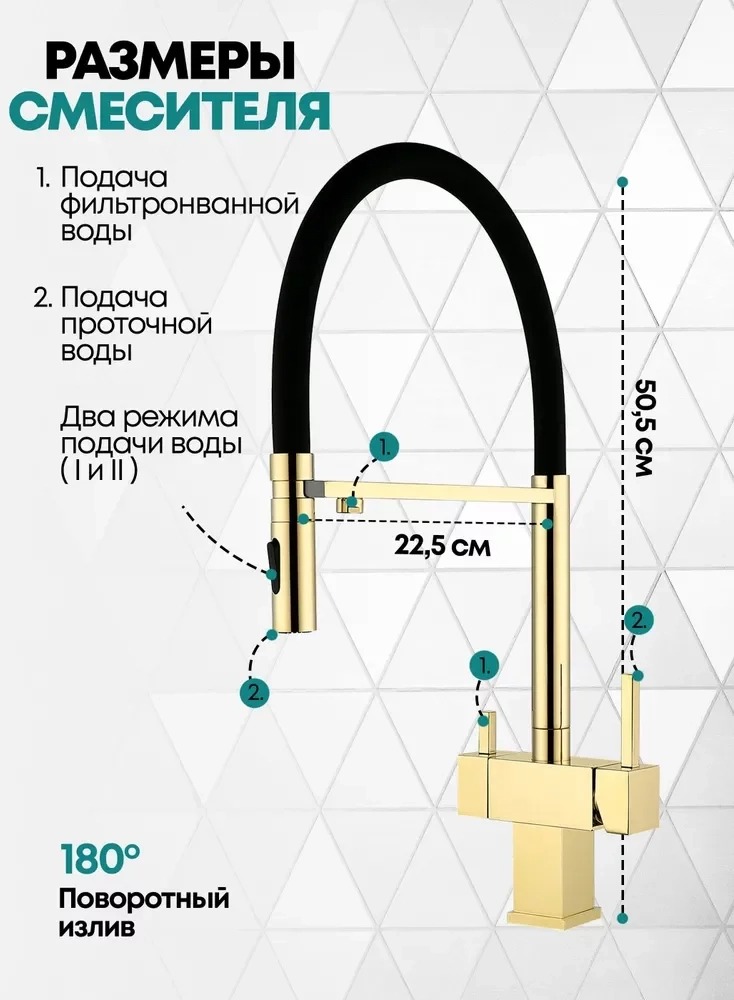 - Смеситель с подключением к фильтру и двумя режимами лейки.