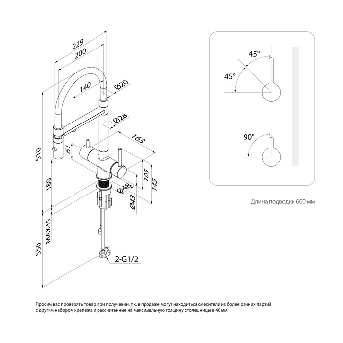 - 2 ручки: для включения фильтрованной воды и для обычной водопроводной (угол открывания ручки – 90 градусов, на себя; может отличаться в зависимости от партии). Фильтр в комплекте не идет и приобретается отдельно.