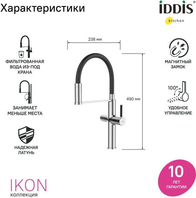 Смеситель для кухни Iddis Ikon IKNSBFFi05 с гибким изливом и подключением питьевой воды, материал латунь, цвет хром глянцевый.