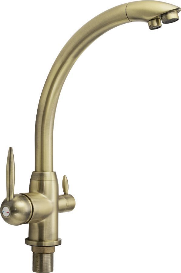 Смеситель для кухонной мойки и раковин, с двойным выпуском воды для фильтра, литой корпус под цвет состаренной БРОНЗЫ, из латуни, с высоким С-образным изливом, шаровый, с отдельным переключением от фильтра и проточной воды. Крепление резьба - гайка, картридж d = 40 мм, ручка шток. Аэратор для экономии воды. Такая модель может использоваться на домашней кухне, на даче, в медицинских учреждениях и общественных местах. Габаритные размеры: высота 330 мм, длина 260 мм, диаметр посадочного седла 55 мм, длина резьбы 50 мм, длина подводки 450 мм. Вес - 2,200 кг, объём - 0,00613 м3. В комплекте паспорт, корпус с изливом, подводка 1/2, крепеж, набор прокладок.