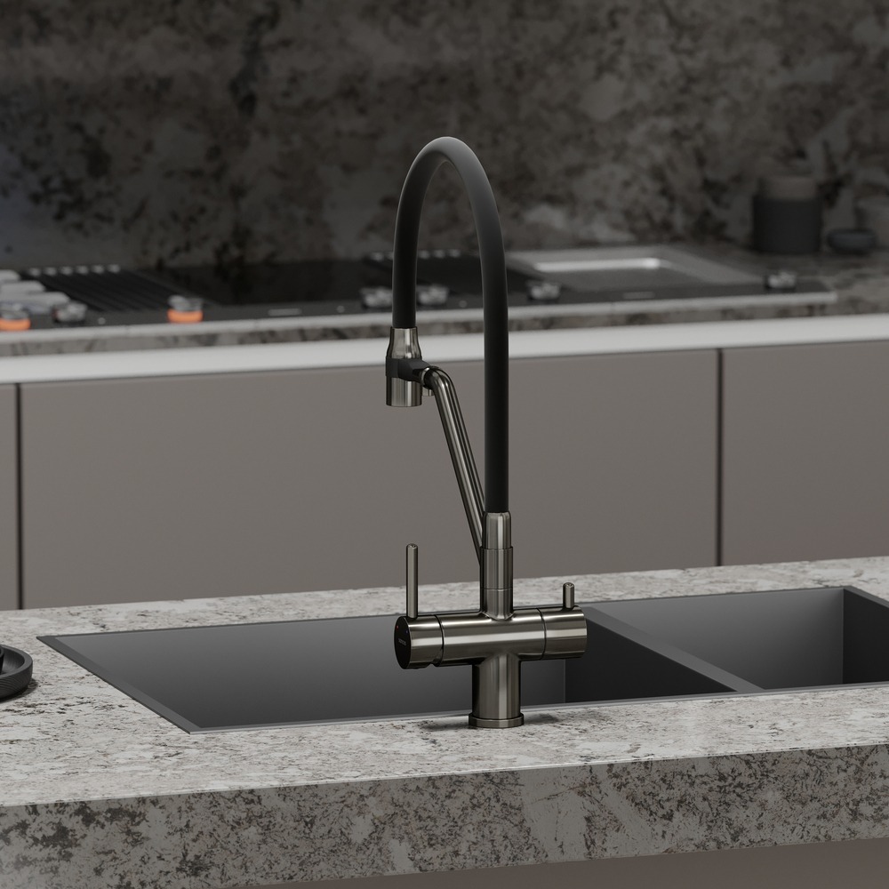 Смеситель для кухни Sancos Dora SC4003GG с гибким, поворотным изливом и подключением фильтра питьевой воды , материал - латунь, цвет - вороненая сталь/чёрный.