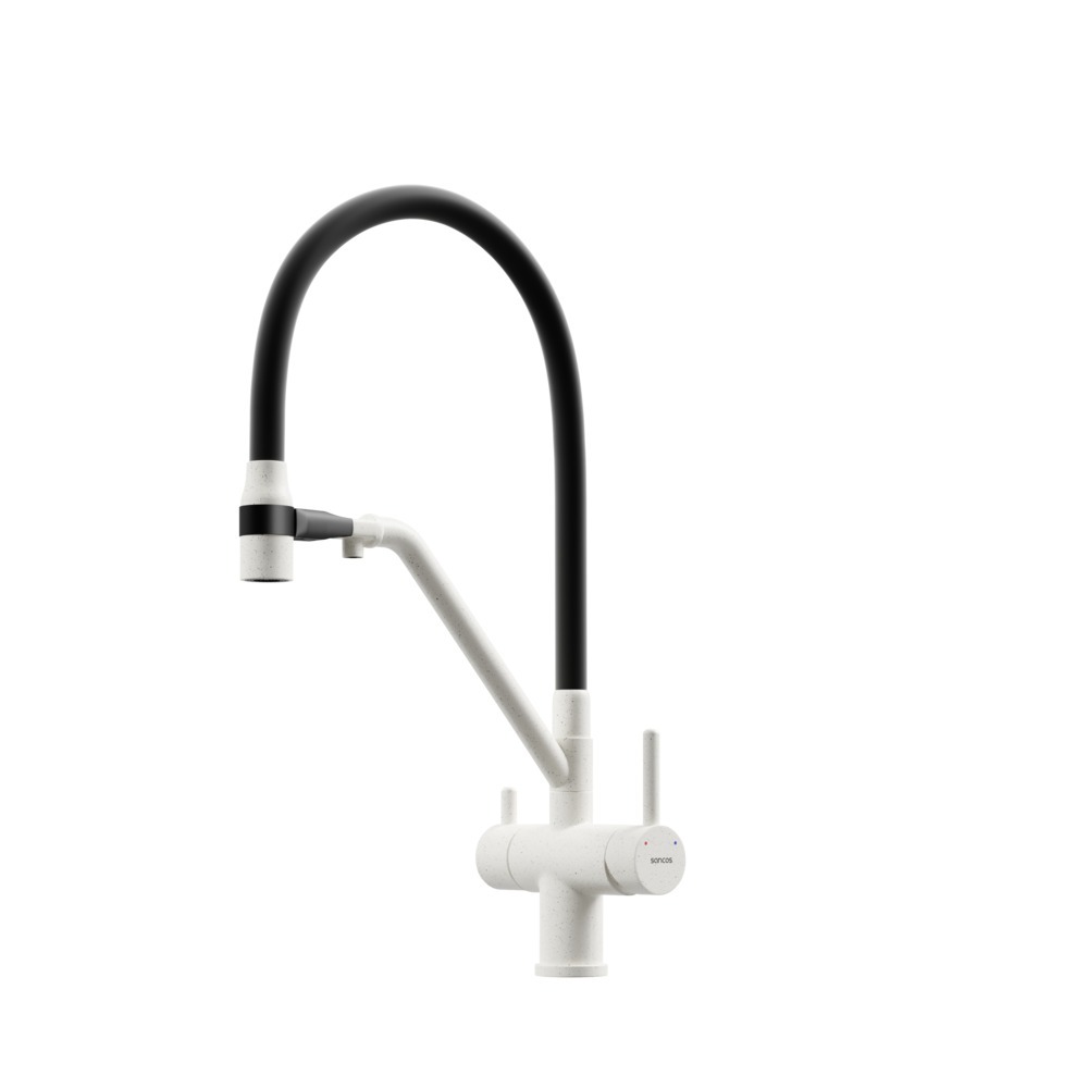 Смеситель для кухни Sancos Dora SC4003GR с гибким, поворотным изливом и подключением фильтра питьевой воды , материал - латунь, цвет - белый гранит/чёрный.